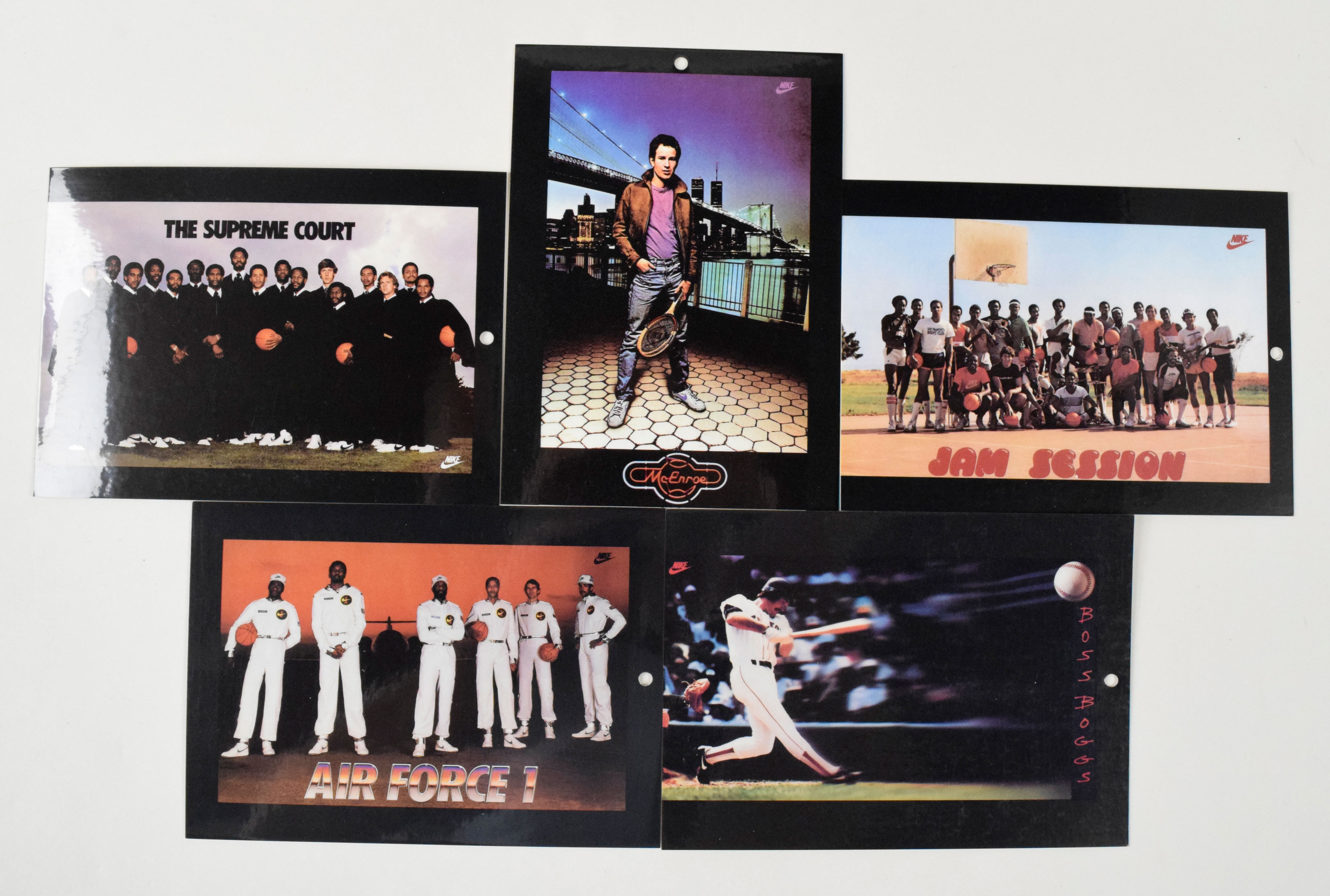 Description:Lot of (27) 1982-85 Nike Poster Cards in original box (Avg. NM) Nice lot of 5"x7" poster cards are in average NM condition with a few grading slightly lesser. Includes McEnroe, Air Force I, Supreme Court, Board Room, Really Big Nike, Air Force, Boss Boggs, Lofton, Jam Session, and others. Box has small tear and some other handling and storage wear: Avg. NM