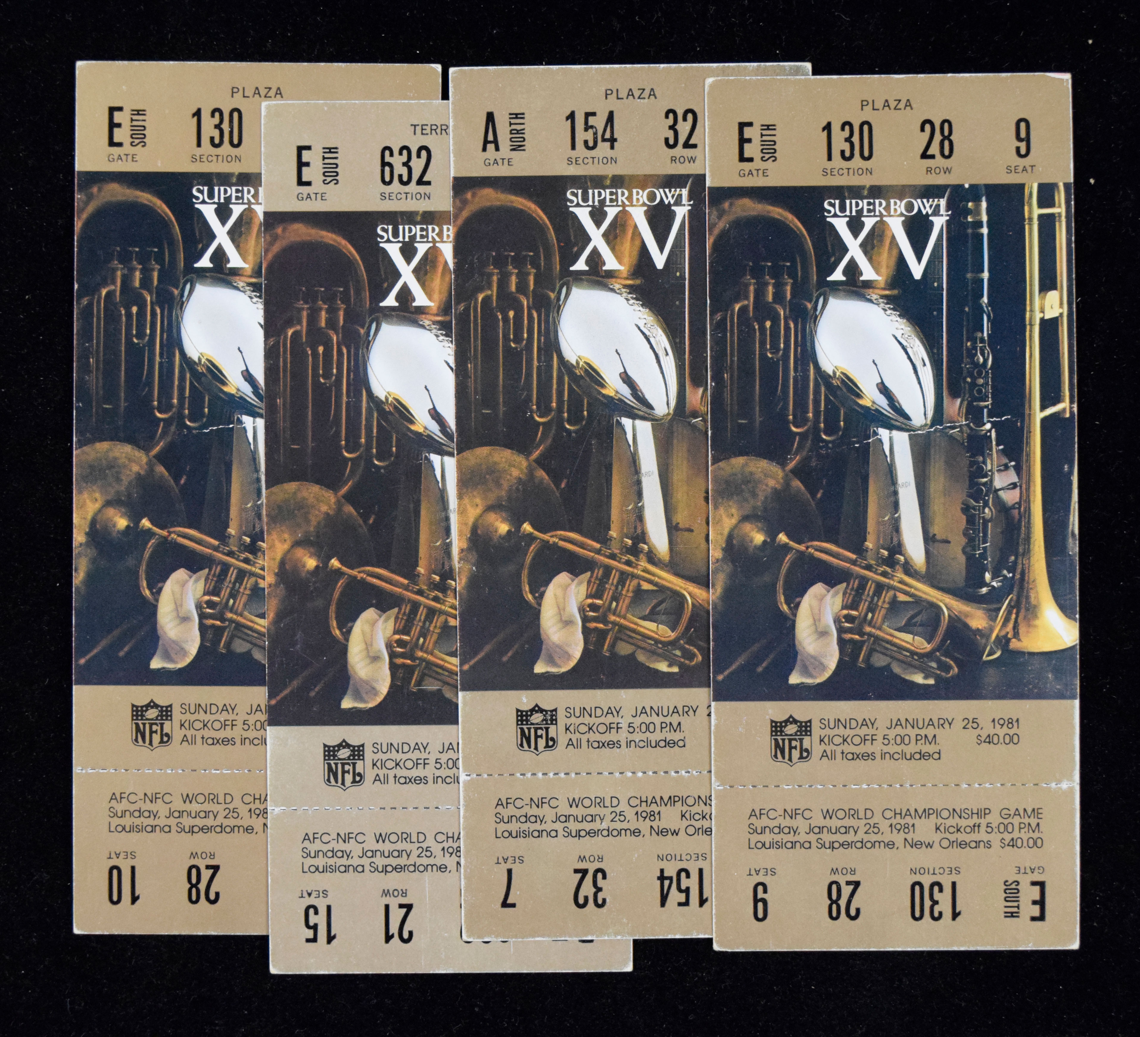 Description:Lot of (4) Super Bowl XV full tickets - Raiders win over Eagles (GD-VG) Includes (2) which have mild corner/edge wear and (2) which have a crease: GD-VG 2100000332984