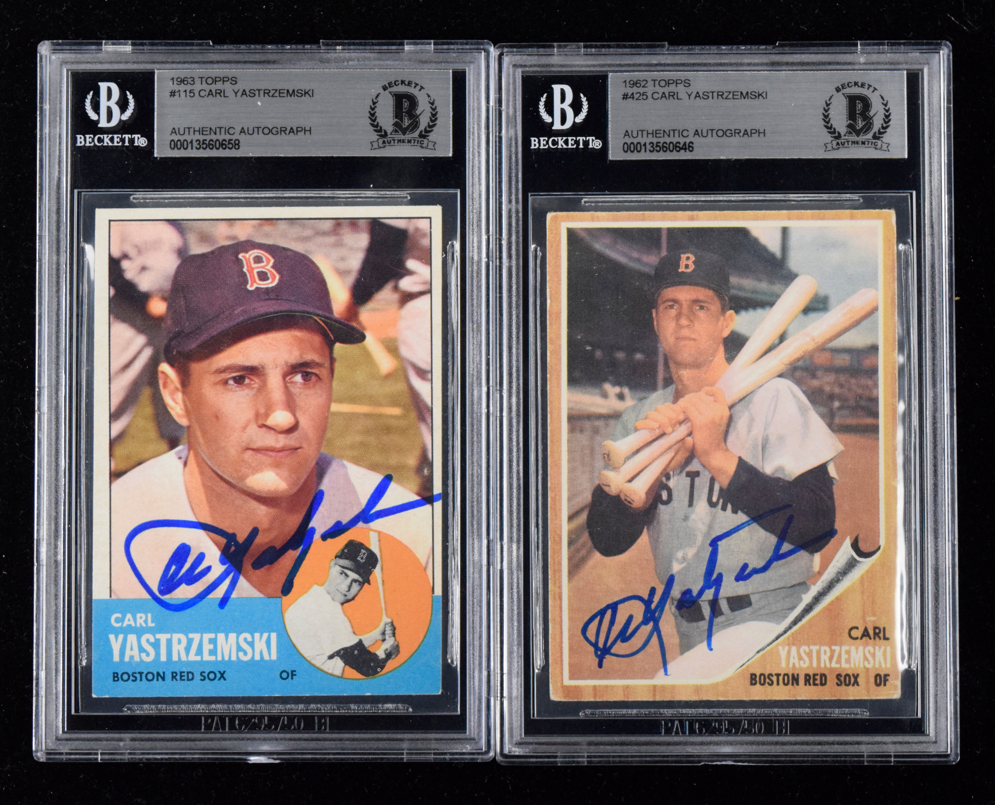 Description:Carl Yastrzemski autographed 1962 and 1963 Topps cards (Beckett) (Sigs. NM, Cards VG and EX-EX/MT) Both signed in marker rating 9-9/10 out of 10. Touch of wear to 1962. Both authenticated and encapsulated by Beckett: Sigs. NM, Cards EX-EX/MT)