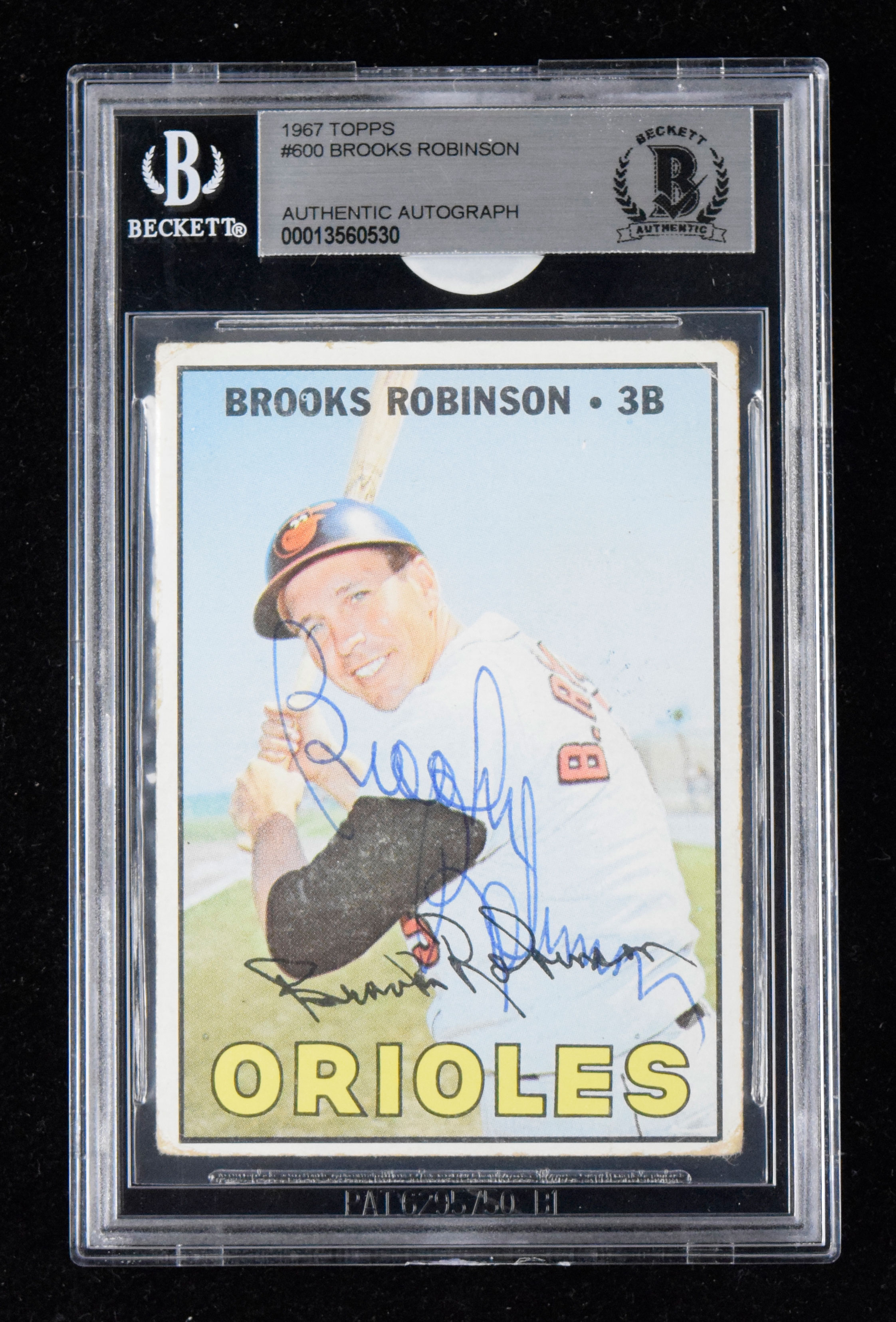 Description:1967 Topps #600 Brooks Robinson autographed card (Beckett) (Sig. NM, Card GD) Signed in ink rating 8 out of 10 and there is wear to corners/edges. Authenticated and encapsulated by Beckett and there is a JSA authentication sticker on the back (JSA COA is not included): Sig. NM, Card GD