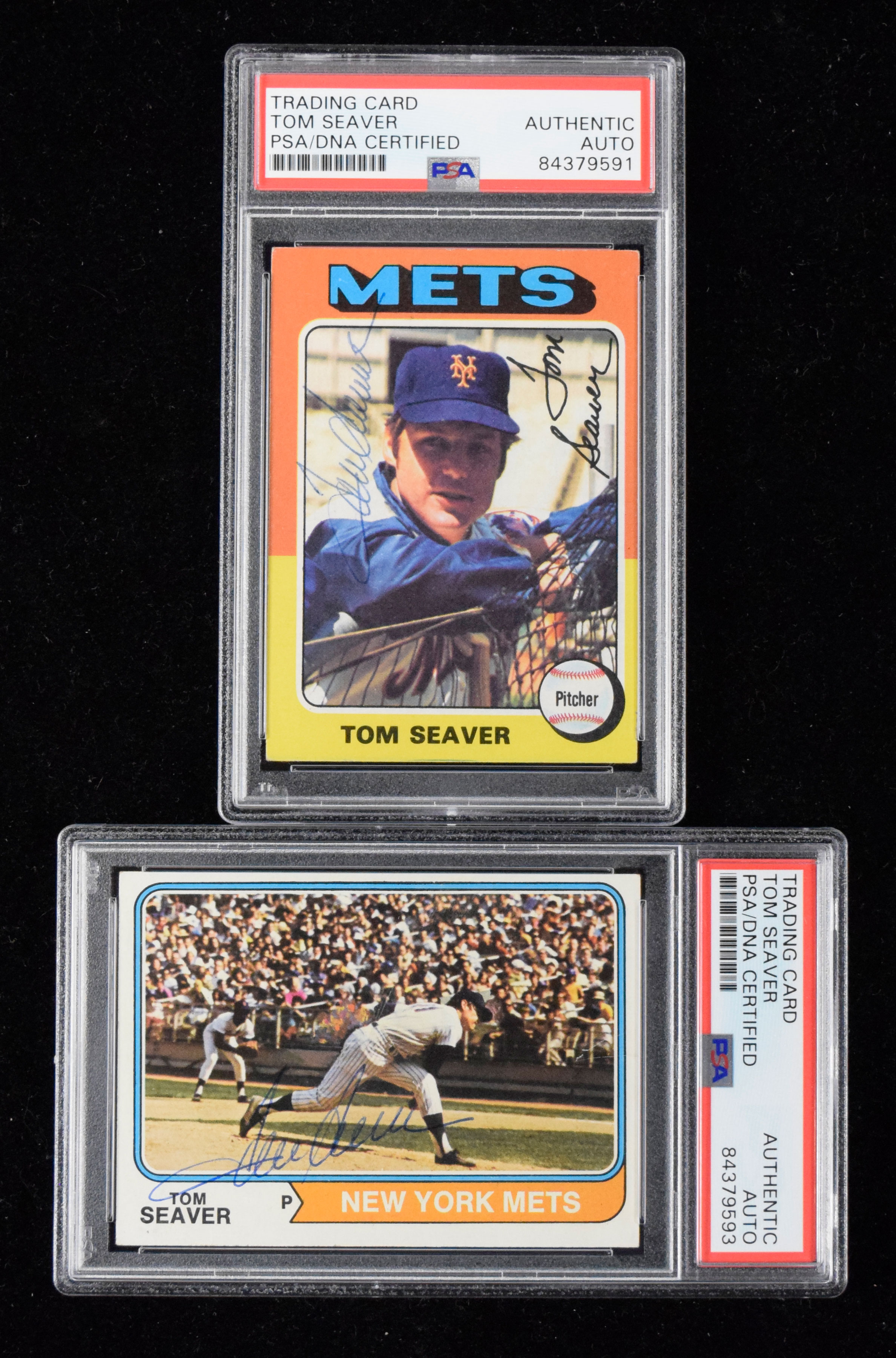 Description:Tom Seaver autographed 1974 and 1975 Topps cards (Sigs. EX/MT-NM, Cards EX-EX/MT) Each signed in ink rating 8 out of 10 and authenticated/encapsulated by PSA: Sigs. EX/MT-NM, Cards EX-EX/MT