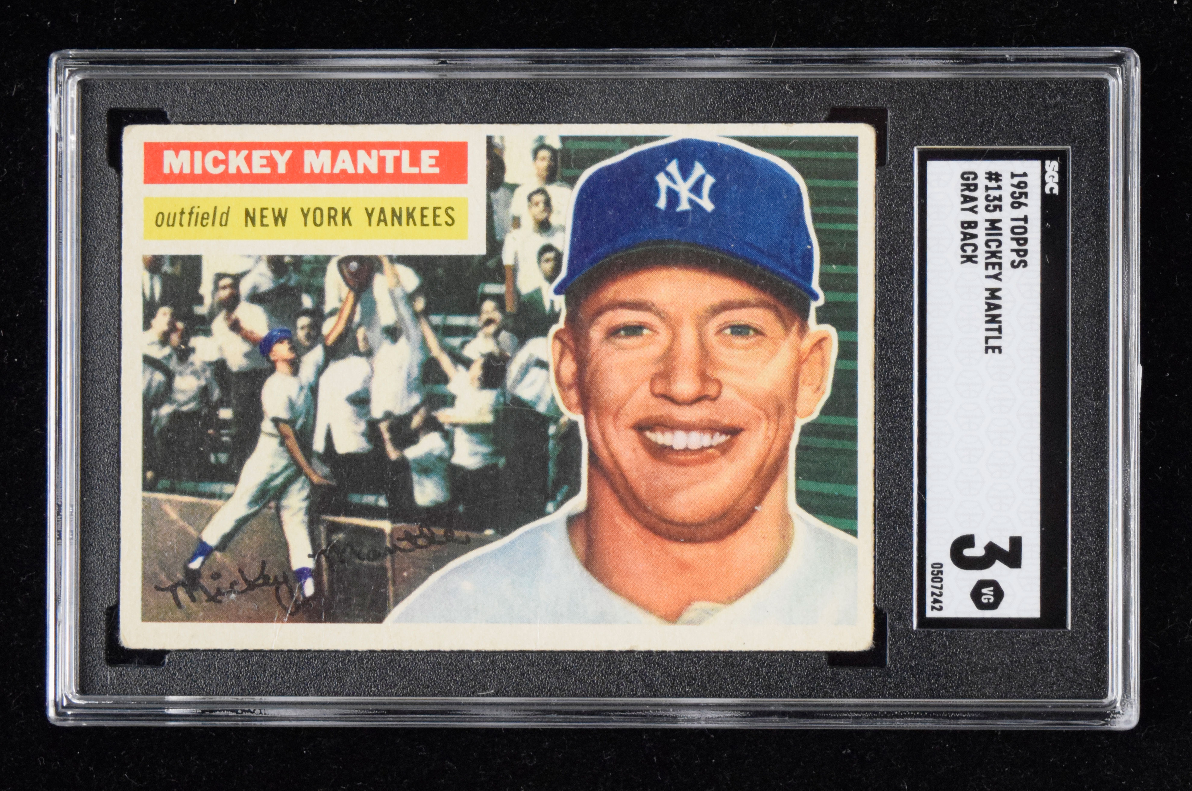 1956 Topps #135 Mickey Mantle (Gray back) (SGC 3 VG) Classic Mantle card shows a touch of light wear with small wrinkle on lower edge: SGC 3 VG ($750-$1,250)