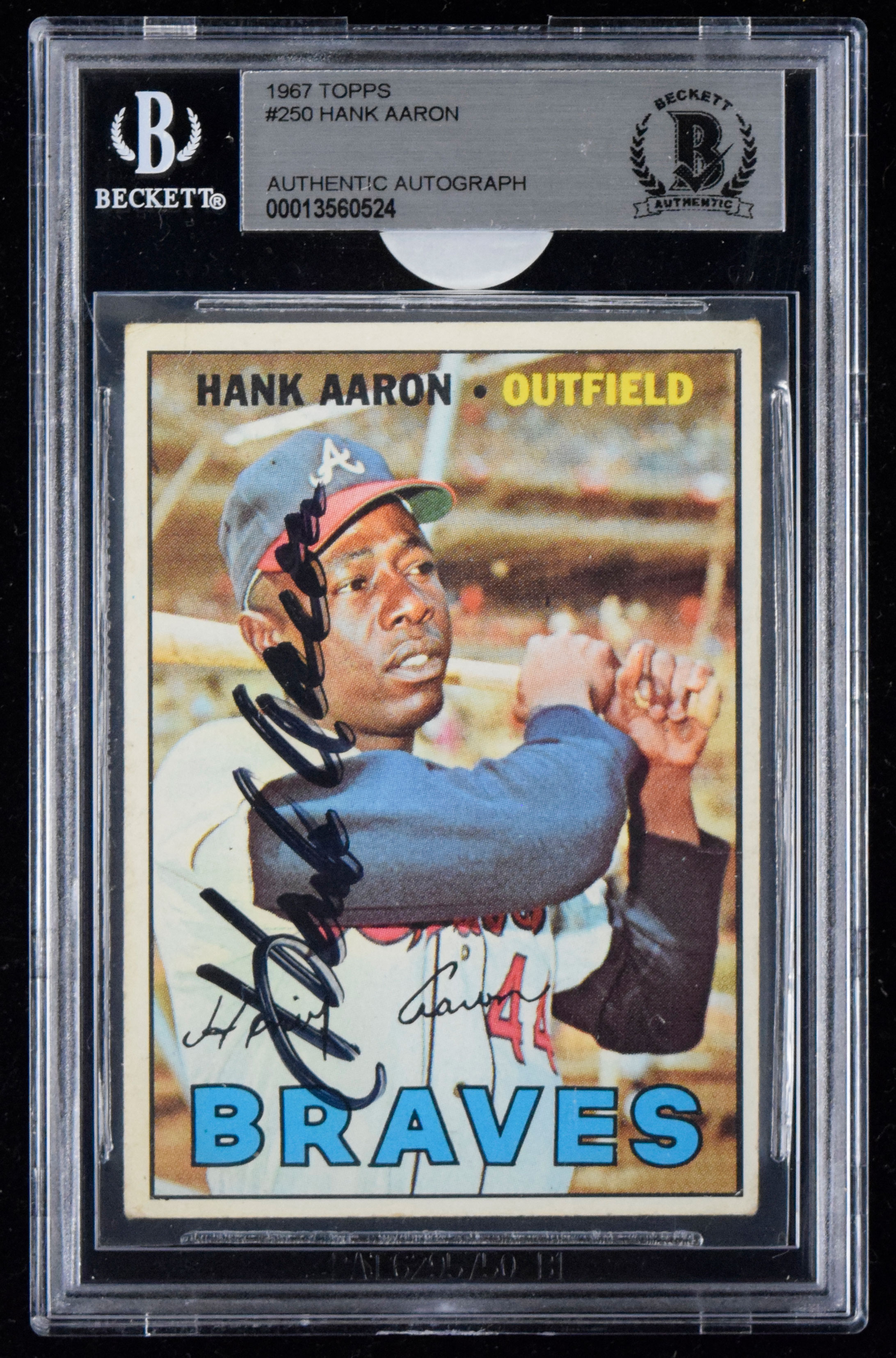 Description:1967 Topps #250 Hank Aaron autographed card (Beckett) (Sig. EX/MT-NM, Card GD/VG-VG) Signed in marker rating 7/8 out of 10. Card has some mild scattered wear: Sig. EX/MT-NM, Card GD/VG-VG ($500-$750)