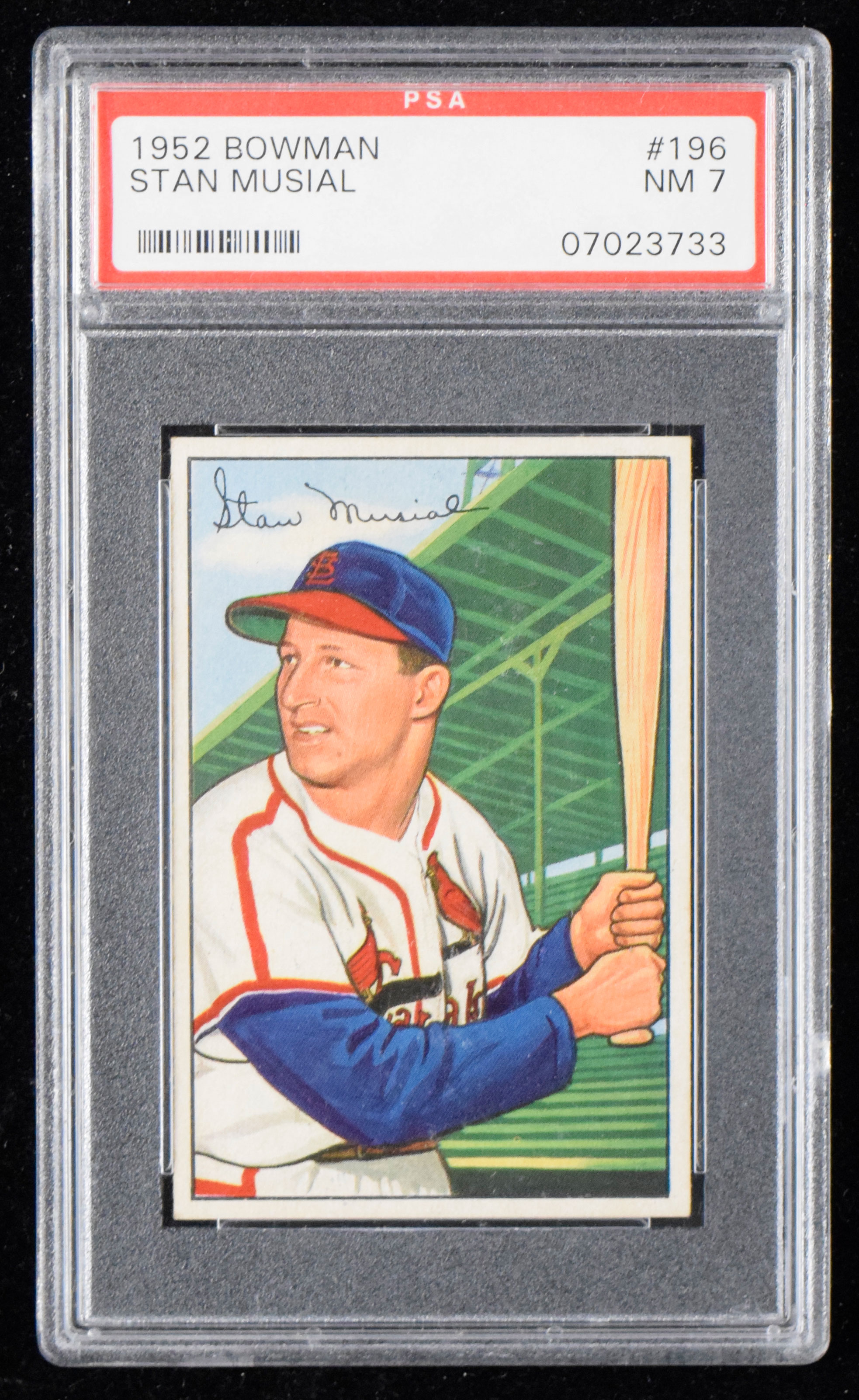 Description:1952 Bowman #196 Stan Musial (PSA NM 7) Outstanding card is well centered with little mentionable wear aside from the slightest touch to extreme tip of lower left corner: PSA NM 7 ($750-$1,250)