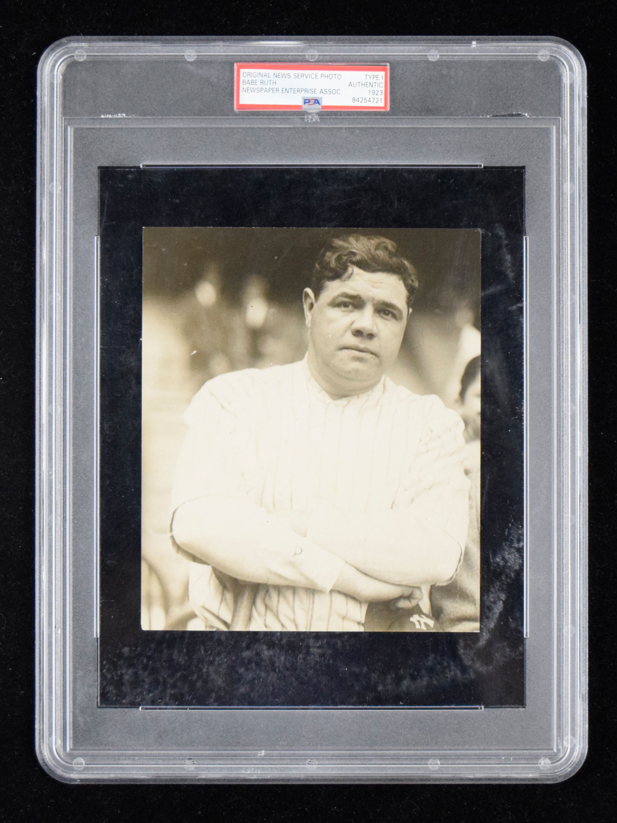Description:1923 Babe Ruth Type (1) photograph - dated just after the Yankees World Series victory (EX) Sepia toned approx. 6"x7" photo showing Ruth in home jersey during the first year of play at Yankee Stadium. "N.E.A." stamp appears on the back along with "OCT 22 1923" date stamp, just after the Yankees won the World Series on October 15th. Authenticated and encapsulated by PSA with "TYPE I" designation. Touch of light visible wear: EX ($750-$1,250)