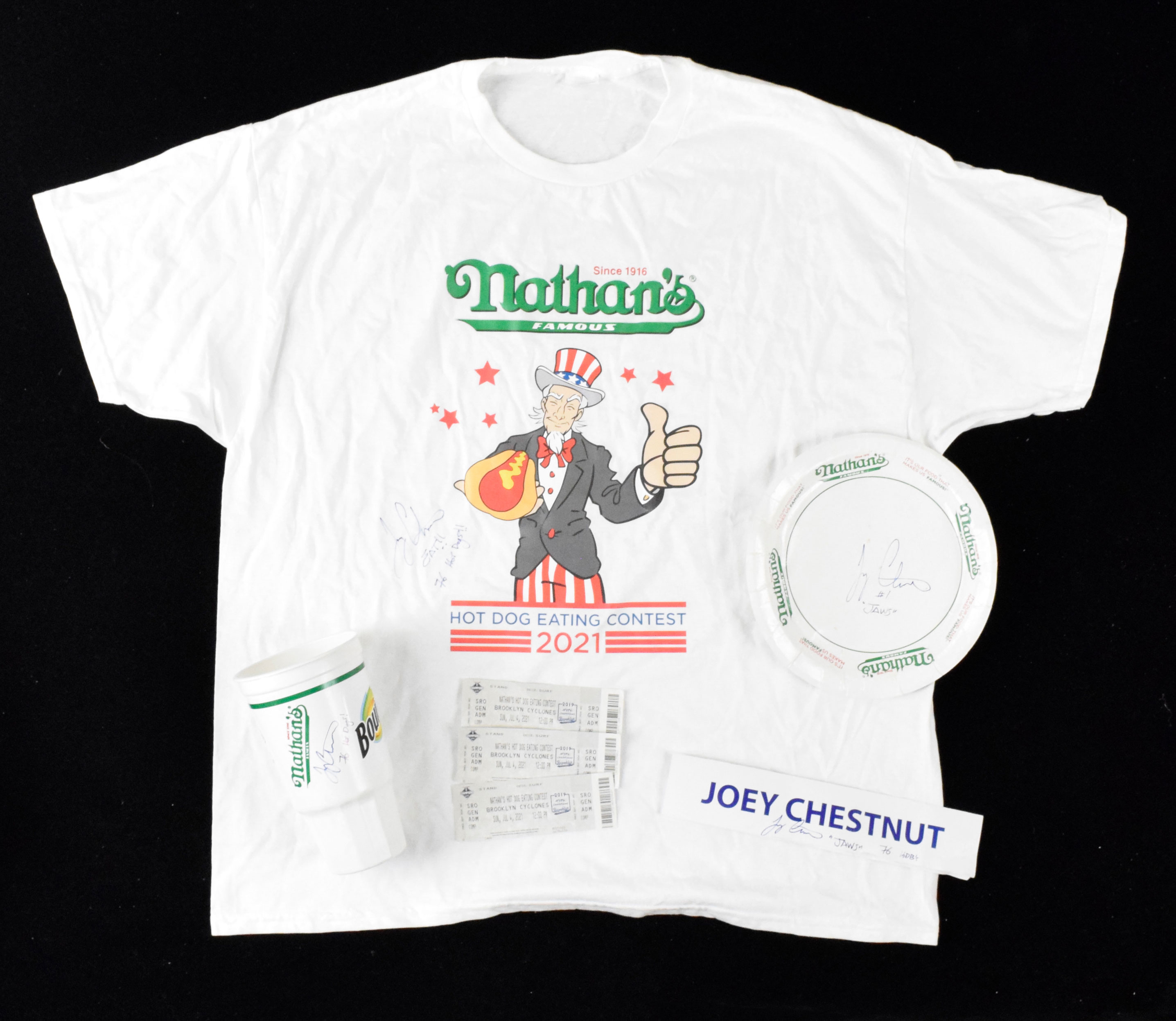 Description:Joey Chestnut autographed dunking cup, nameplate, and paper plate from his 2021 record setting (76) Hot Dog eating performance (EX) Interesting assortment of pieces which were obtained following the competition by a fellow competitive eater. Includes original Nathan's branded plastic cup (with sponsor Bounty logo decal on the side) which was used to dunk buns. Signed "Joey Chestnut 76 Hot Dogs!"; Nathan's branded paper plate which is signed "Joey Chestnut #1 Jaws" (wrinkles/wear); and heavy paper stock nameplate signed "Joey Chestnut Jaws 76 HBDs (wrinkles/some wear). Also includes a Nathan's 2021 Hot Dog Eating Contest t-shirt signed "Joey Chestnut Eat!! 76 Hot Dogs!!", (3) traditional format tickets to the event (varying degrees of wear), and (5) paper print out tickets to the event. Marker signatures rate 7 to 9 out of 10: EX ($500-$1,000)