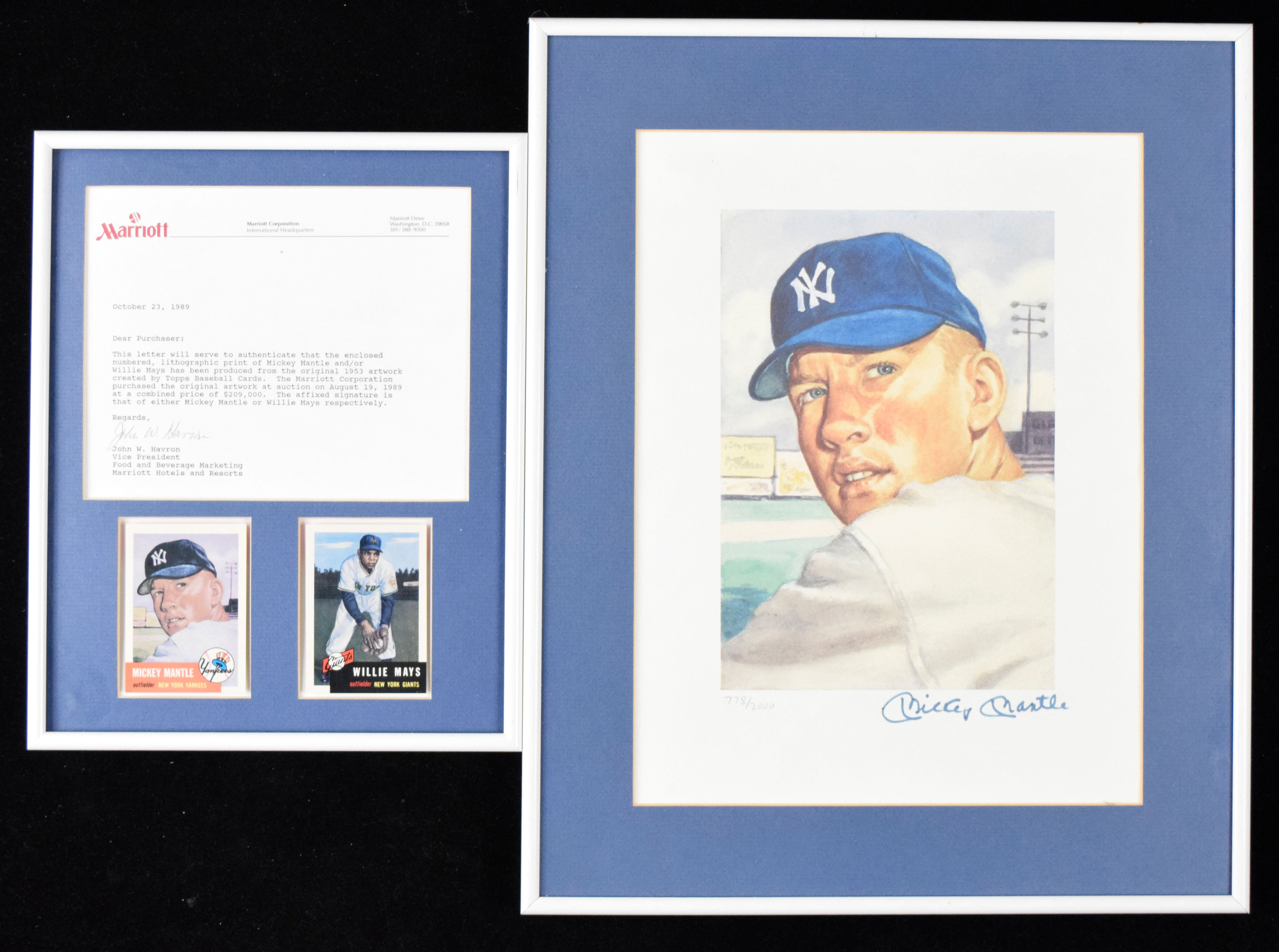 Description:Mickey Mantle signed limited edition 1953 Topps artwork lithograph with original documentation (NM) Lithographic print of the artwork used for his 1953 Topps baseball card has been signed "Mickey Mantle" in marker rating 8 out of 10. Hand numbered "778/2000" and framed to 15.25"x18.75" for display. Includes smaller frame (10.25"x13") which holds the original letter of authenticity from Marriott Corporation: NM ($400-$600)