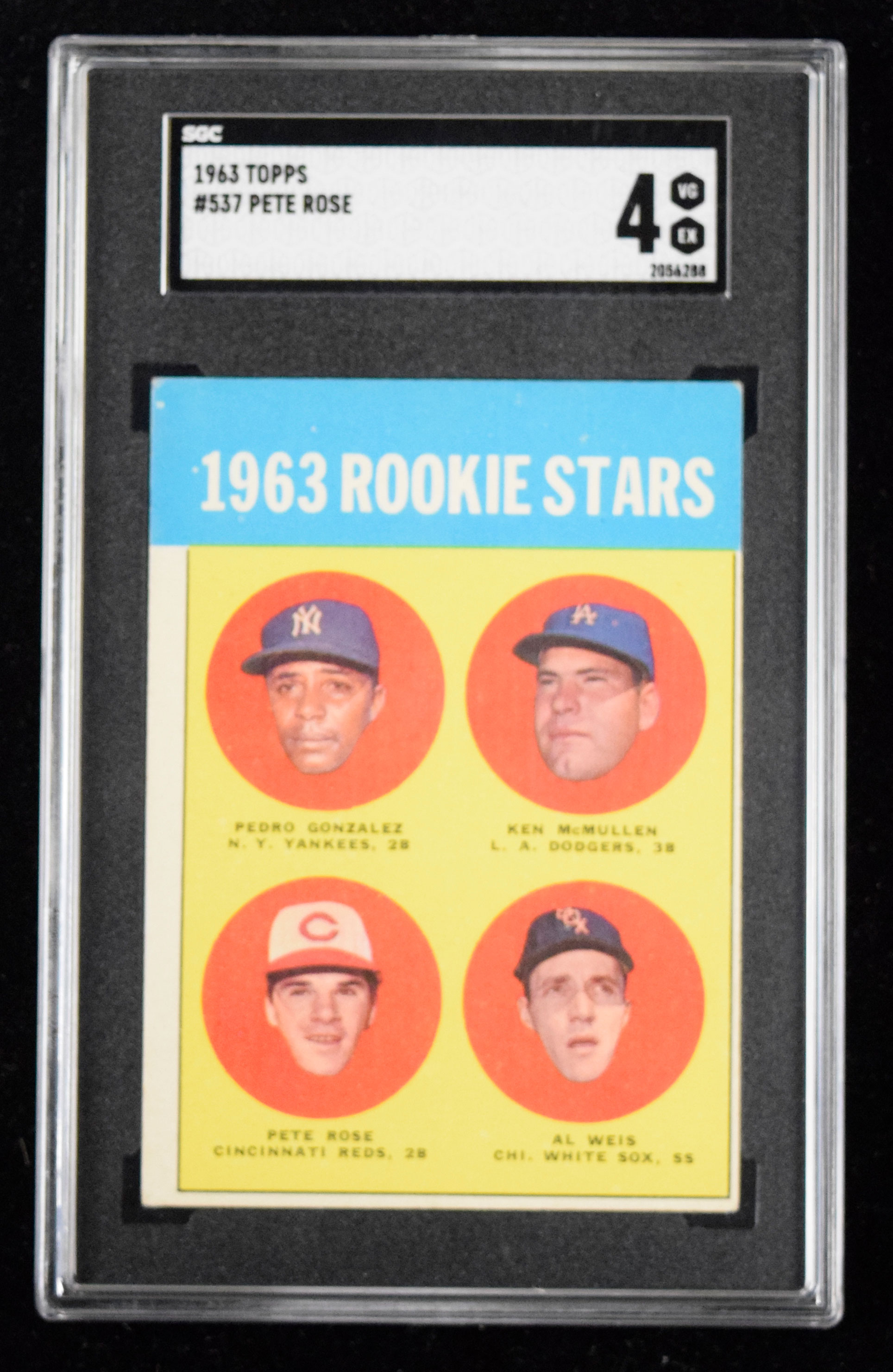 Description:1963 Topps #537 Pete Rose Rookie (SGC 4 VG EX) Key Rookie card showing a touch of light wear with centering, which favors the right edge, accounting for technical downgrade: SGC 4 VG EX ($1,000-$1,500)