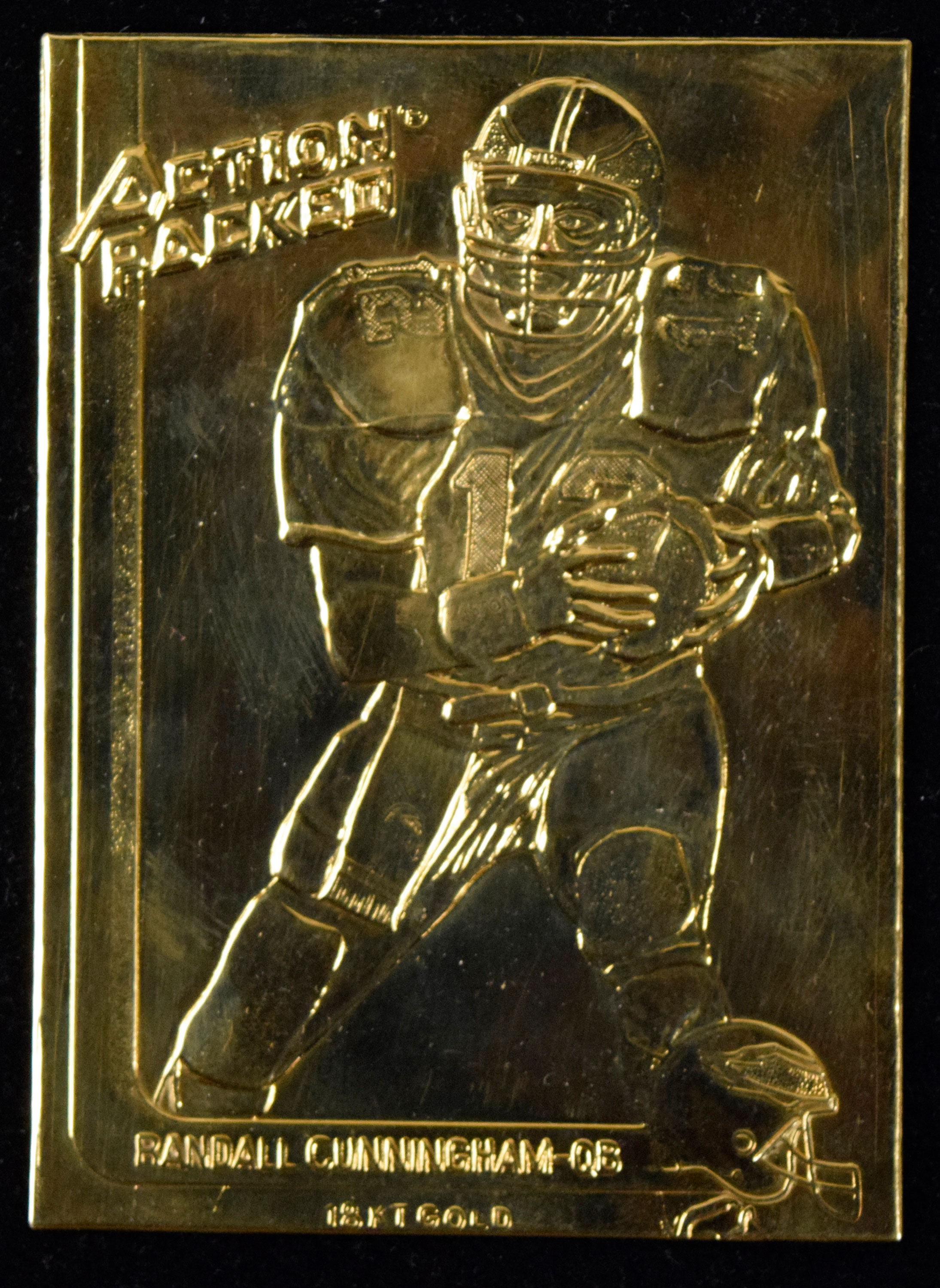 Description:Rare 1991 Action Packed Randall Cunningham 18K Gold football card by Tiffany in original presentation style box (12/26) (EX/MT-NM) Rare card issued by Action Packed as part of a redemption/promotion for their 1991 Football product line. Number "12/26" on the back which is marked "Tiffany & Co." Purity of "18KT Gold" is noted on the front in raised lettering. In fine overall condition with the slightest touch of light handling wear and there is some incidental loss to the red color inlay of the text on back. In original Tiffany marked presentation style box: EX/MT-NM ($3,000-$4,000)