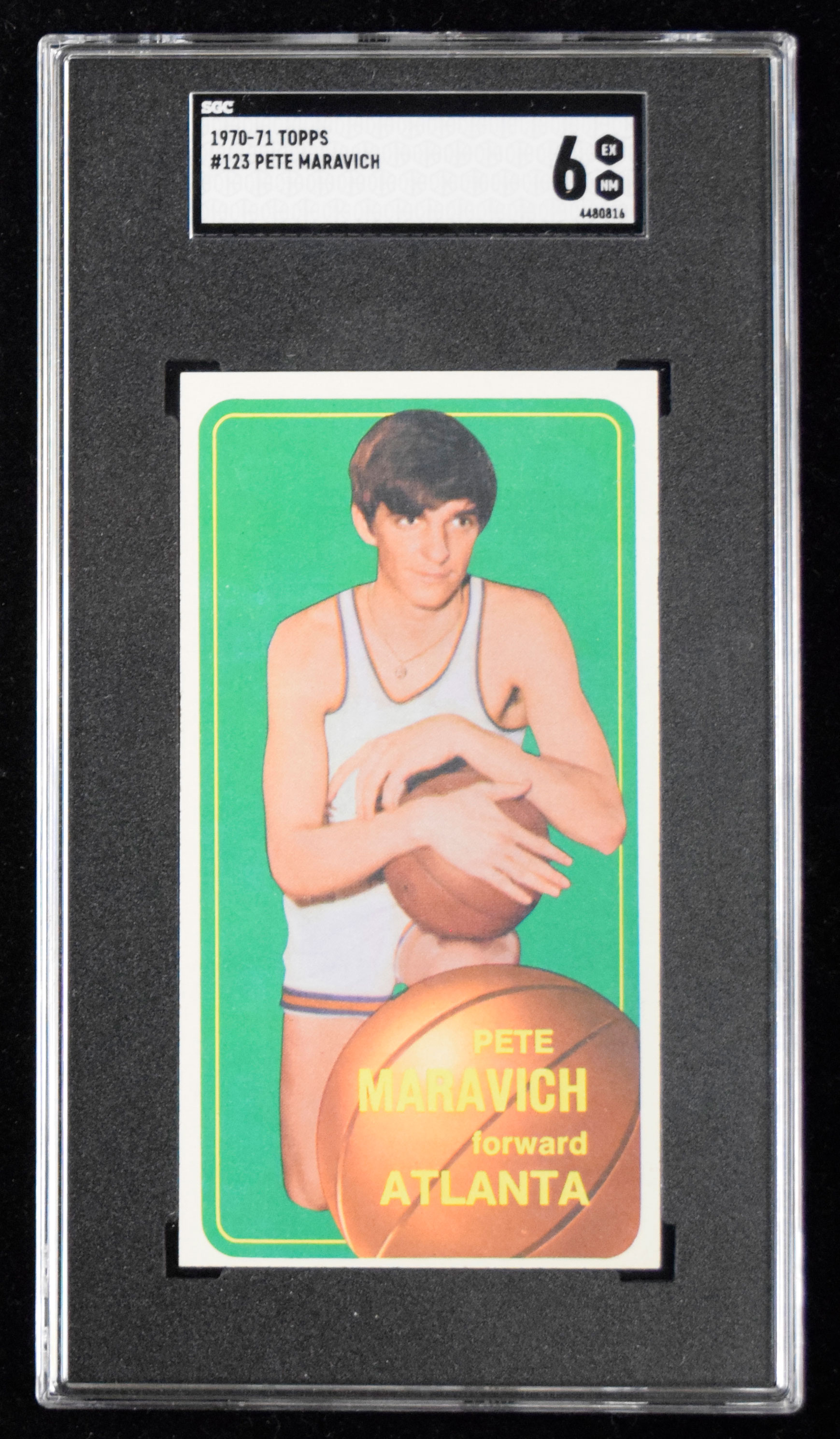 Description:1970-71 Topps #123 Pete Maravich Rookie (SGC 6 EX NM) Sharp corners and edges with centering that favors lower edge accounting for technical downgrade of an otherwise superior card: SGC 6 EX NM ($500-$750)