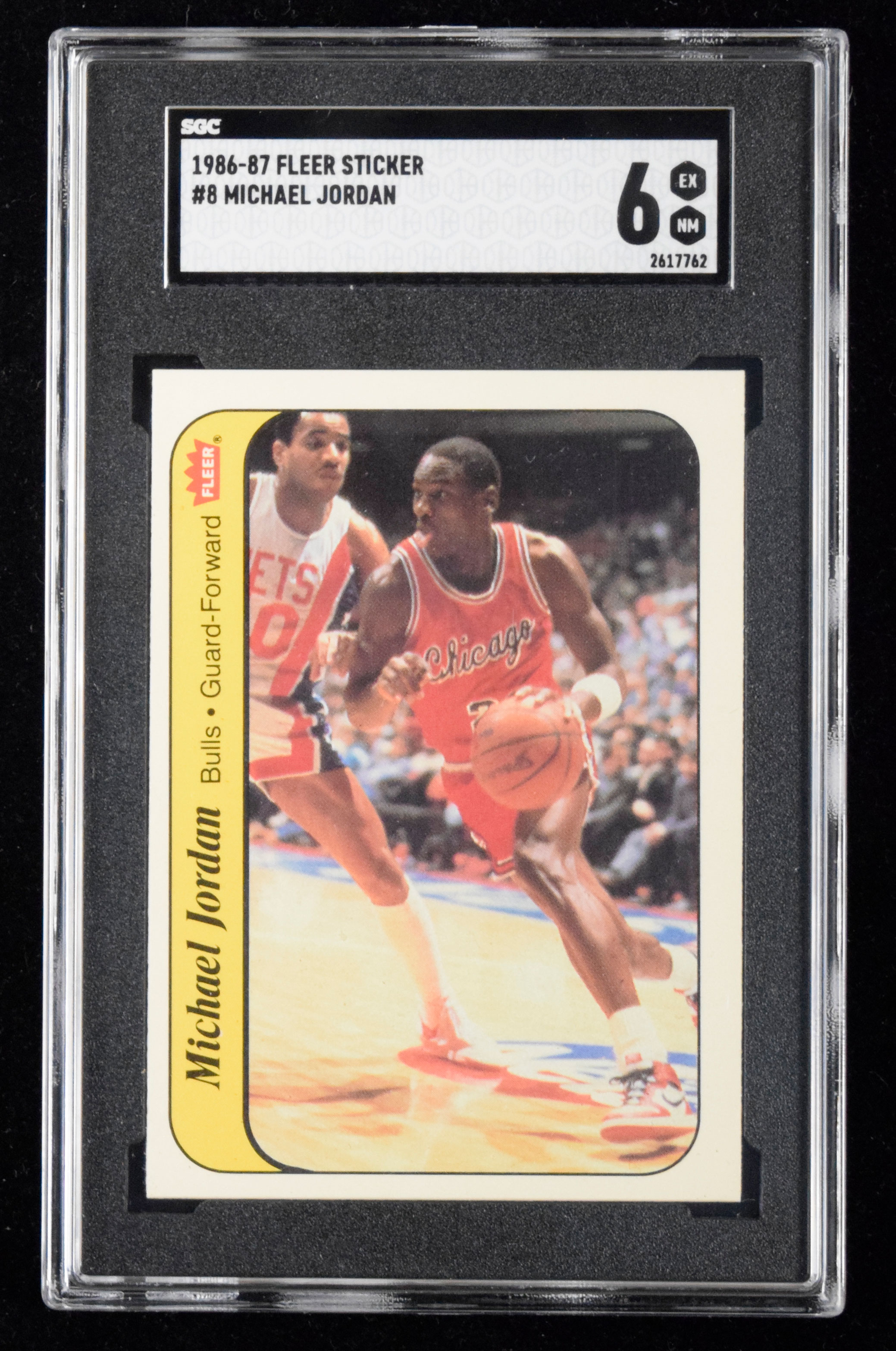Description:1986-87 Fleer Stickers #8 Michael Jordan (SGC 6 EX NM) Centering, which favors the lower left, accounts for technical downgrade of card which otherwise shows little mentionable wear: SGC 6 EX NM ($500-$750)