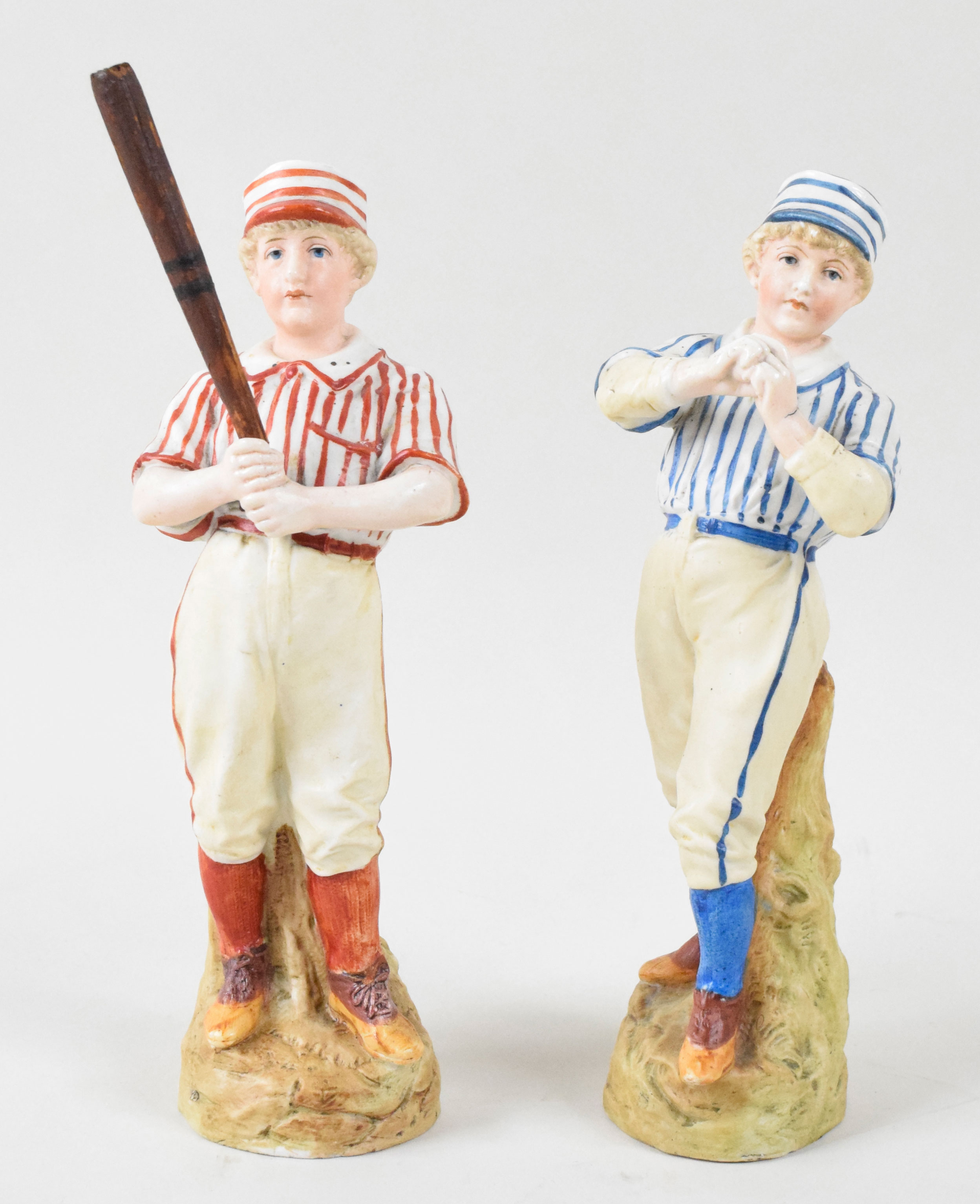 Description:Heubach German bisque porcelain baseball figurines c.1880s (EX-EX/MT Classic pitcher and batter figurines stand around 10" tall each with hand painted blue and red pinstriped uniforms. In nice overall condition with some light age to the surfaces. The pitcher figure has a small surface crack along the wrist of each hand however this appears to be some sort of production anomaly and the pieces have not cracked (nor have they been repaired). Bat is a replacement: EX-EX/MT ($500-$750)