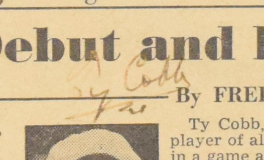 Description:Ty Cobb autographed "Cobb In Debut and Farewell Against Yanks" newspaper clipping (full JSA LOA) (EX) Article clipped from a newsprint publication (approx. 5.25"x8.25") has been signed "Ty Cobb" in fountain pen rating 7-7/8 out of 10. Light toning. Includes full LOA from JSA: EX ($500-$750)