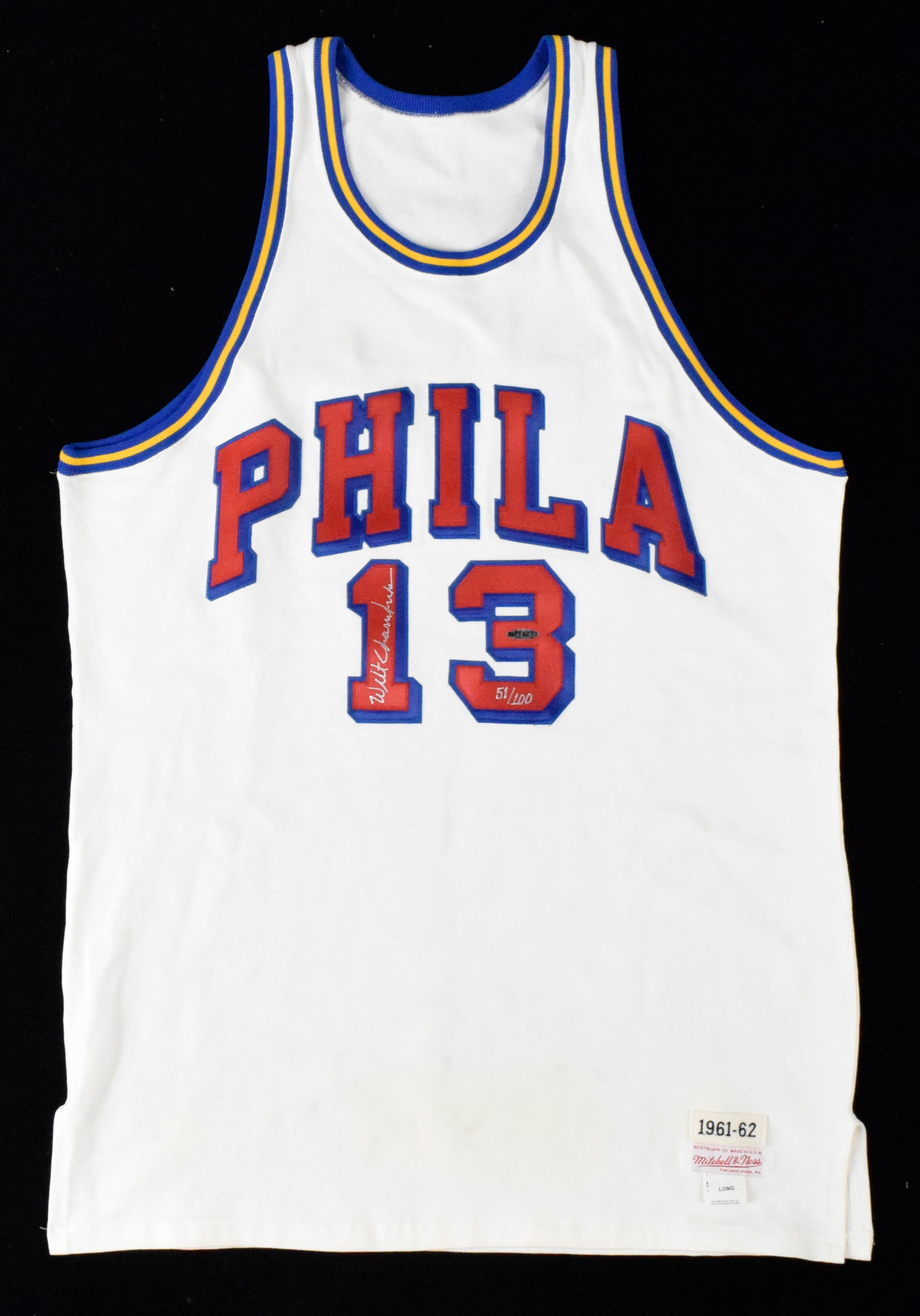 Description:Wilt Chamberlain autographed Philadelphia Warriors limited edition jersey (UDA) (Sig. NM, Jersey EX-EX/MT) Throwback 1961-62 style Warriors jersey by Mitchell & Ness (size 46 long) has been signed "Wilt Chamberlain" on the front number in silver marker rating 9 out of 10. Hand numbered "51/100" with Upper Deck Authentication hologram affixed. Displays very well however there is a small area of toning/discoloration to lower front. Includes UDA COA and registration card: Sig. NM, Jersey EX-EX/MT ($3,000-$5,000)