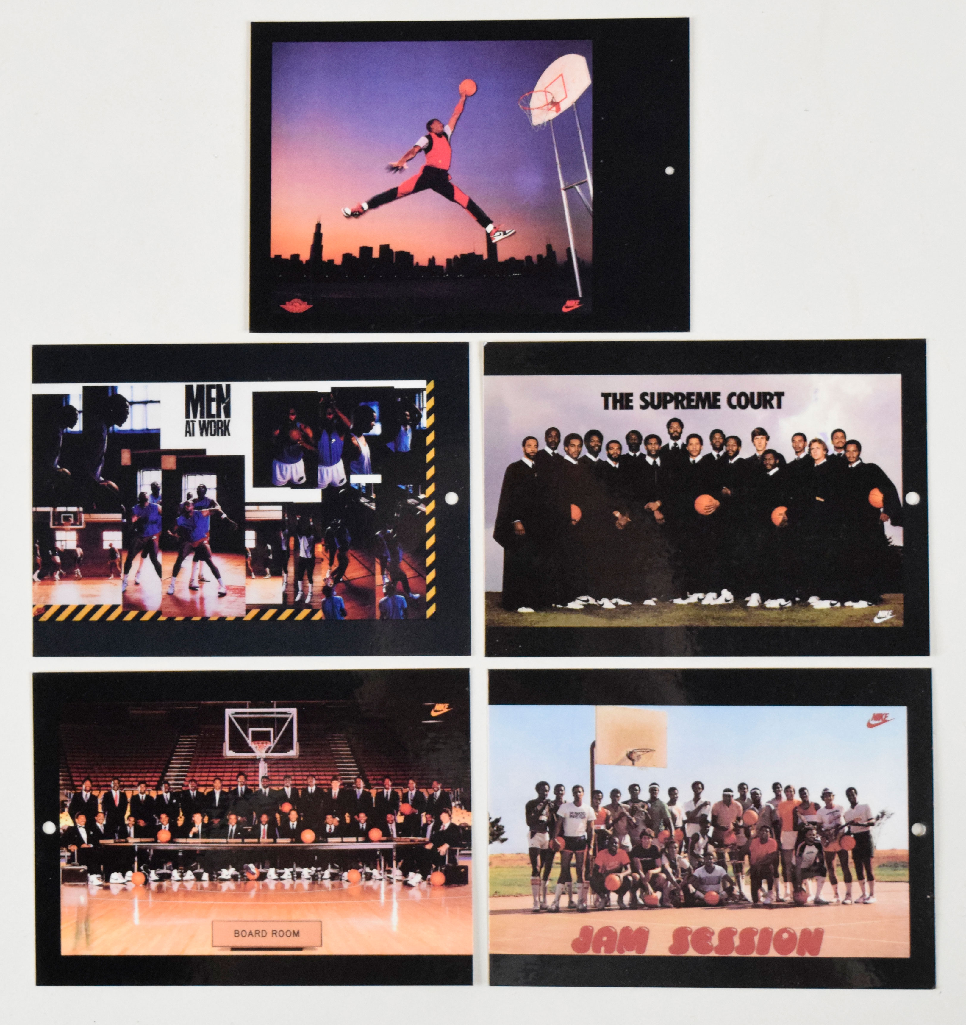 Description:Lot of (38) 1982-85 Nike Poster Cards in original box including #850 "Air Jordan" (Avg. EX-NM) Nice lot of 5"x7" poster cards in EX-NM condition with most around EX-EX/MT having a touch of light wear. Key card #850 "Air Jordan" is EX with a touch to corners. Includes Air Force, Mac II, Cornerstone, Men At Work, Really Big Nike, Supreme Court, Moses, Jam Session, McEnroe, Boardroom, and others. Box has small tear and some other handling and storage wear: Avg. NM ($750-$1,000)