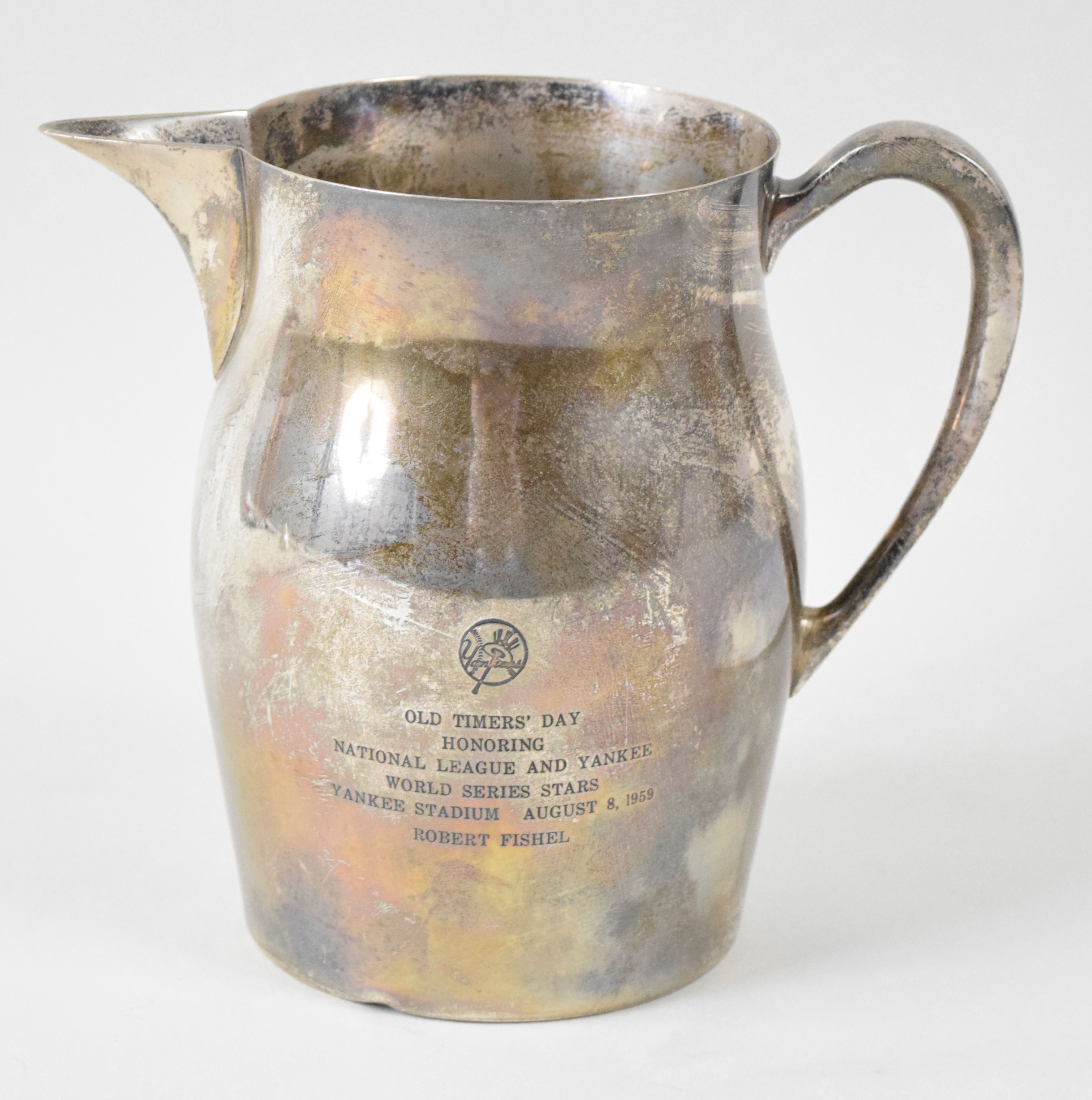 Description:1959 Yankees Old Timers Day "Honoring National League and Yankee World Series Stars" Sterling Silver presentational pitcher (EX) Handled pitcher (7" tall) has the Yankees logo and 1959 Old Timers Day text impressed in the side along with the name "Robert Fishel" (a long time Yankee executive to whom the piece was presumably given). Marked "Sterling by Poole…Paul Revere Reproduction" on the underside. The piece weighs (1) pound, (8) ounces. Mild tarnish and some light handling wear: EX ($500-$750)