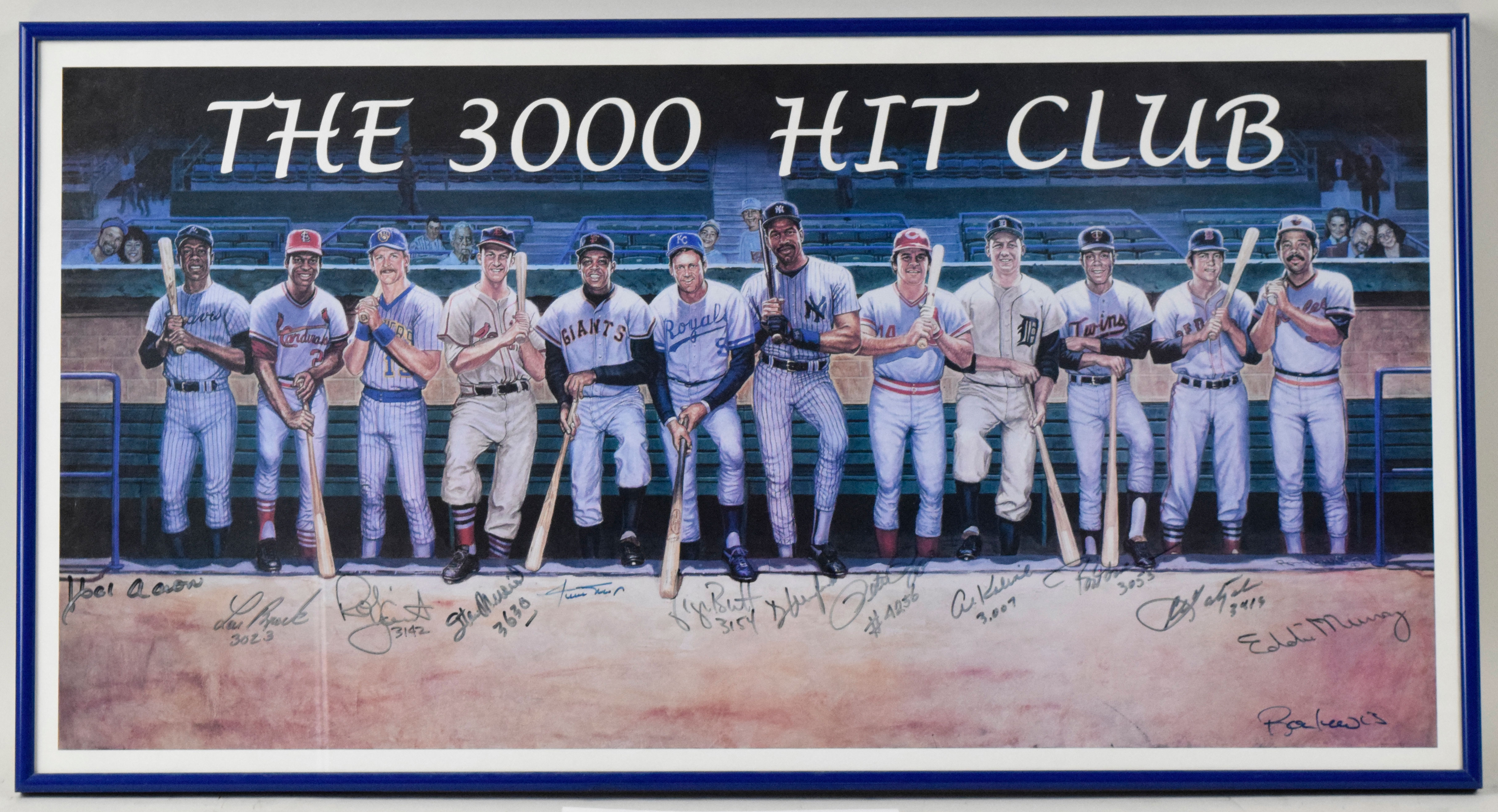 Description:3,000 Hit Club signed poster with (12) autographs incl. Mays and Aaron (EX-NM) Large format poster (framed to 20"x37.5" ) has been signed by Aaron, Mays, Murray, Rose, Brock, Yount, Musial, Brett, Winfield, Kaline, Carew, and Yastrzemski. All but Aaron, Mays, Winfield, and Murray have inscribed their hit totals. Marker signatures rate 7 to 7/8 out of 10. Touch of wear to frame: EX-NM ($500-$750)