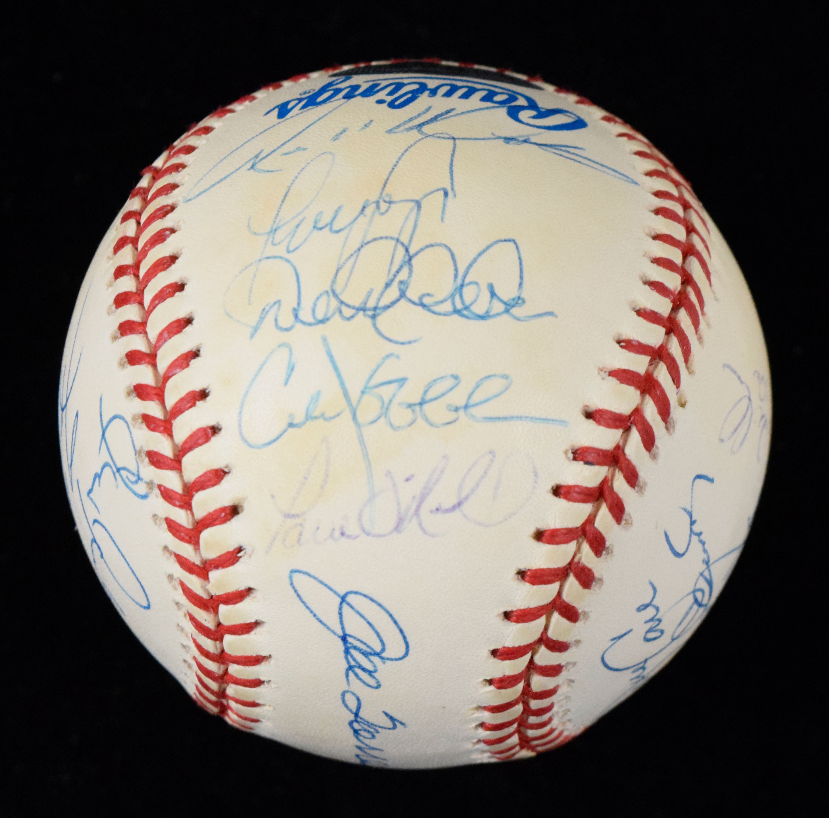 Description:1999 New York Yankees team signed limited edition World Series logo baseball (Steiner) (EX-NM) Rawlings B.Selig World Series logo ball has been signed by (19) incl. Derek Jeter, Mariano Rivera, Joe Torre, Roger Clemens, Bernie Williams, David Cone, Tino Martinez, Paul O'Neill, and others. Ink signatures generally rate 7/8 to 8 out of 10 with Williams and O'Neill slightly lesser (6-6/7). Light toning. Hand numbered "2/199" (numbering faded) and includes COA from Steiner Sports: EX-NM ($500-$750)
