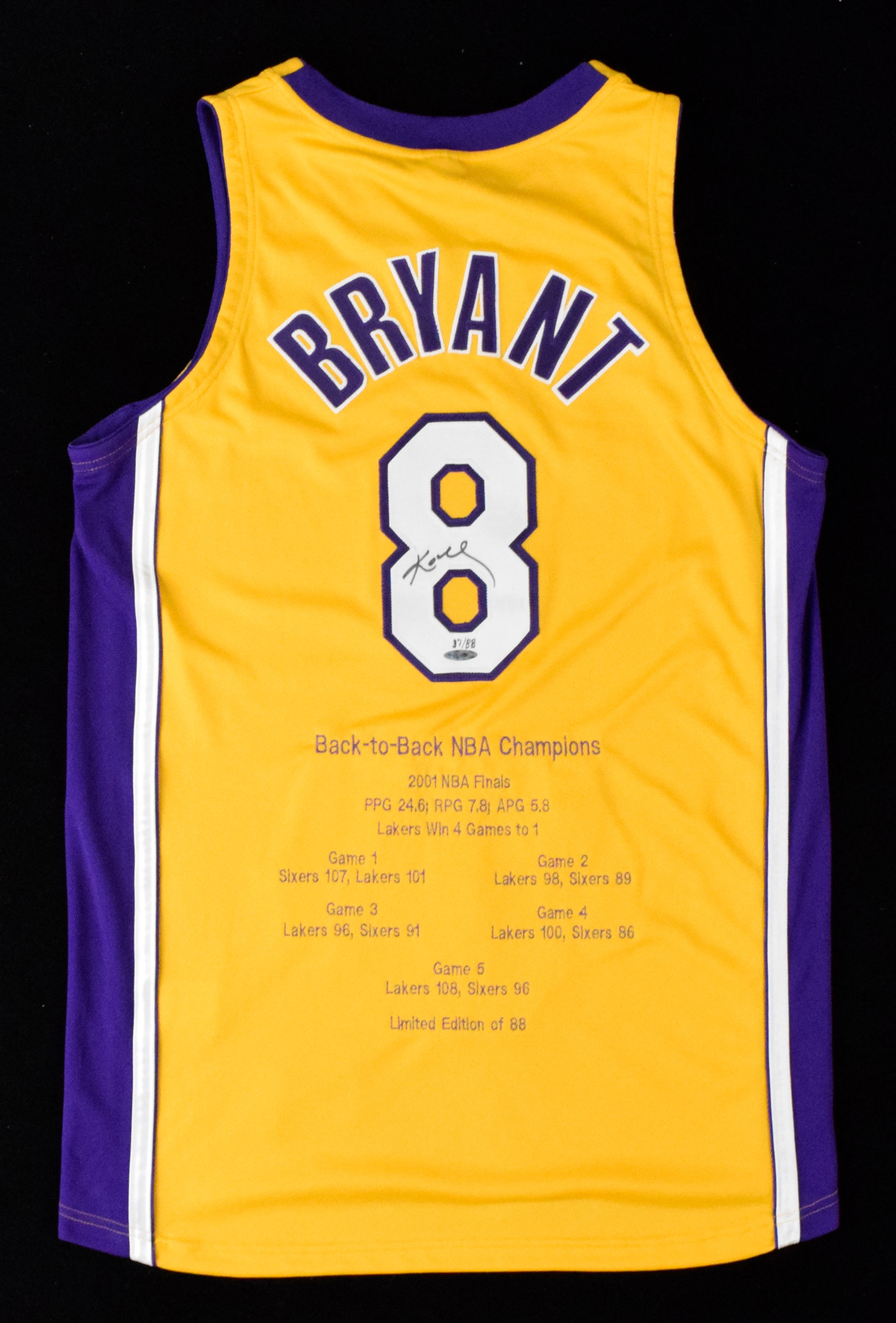 Description:Kobe Bryant autographed Los Angeles Lakers limited edition "Back-to-Back NBA Champions" jersey (UDA) (NM) Yellow jersey by Nike (size 46 with +4 length) has been signed "Kobe" on the back number in marker rating 7/8-8 out of 10. There is an NBA Finals patch on the front and embroidered throughout the back is text related to the 2001 Finals and their back-to-back Championship wins. Hand numbered "37/88" and there is an Upper Deck Authentication hologram affixed. Includes UDA COA, registration card, and box (some wear to box): NM ($3,000-$5,000)