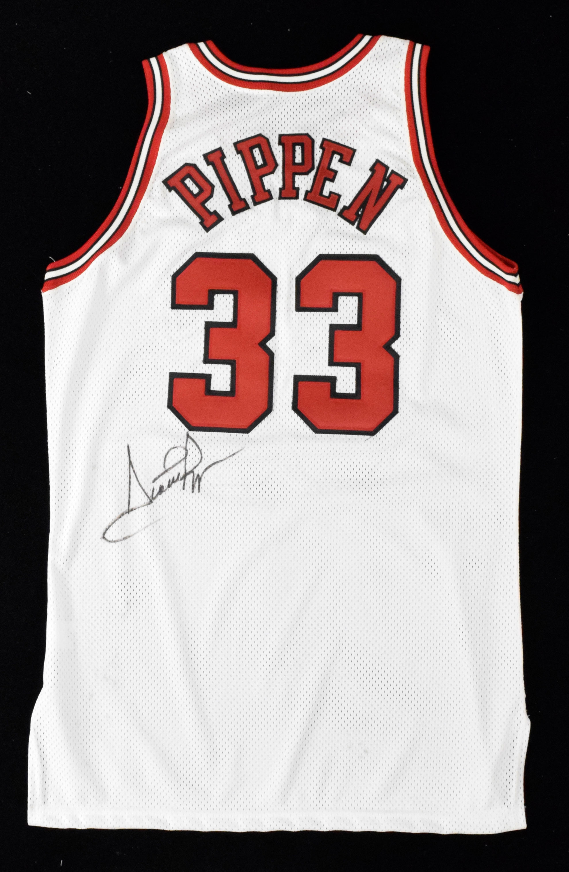 Description:1995-96 Scottie Pippen autographed Chicago Bulls jersey - professional quality (EX/MT) White mesh jersey has "Bulls" team name across the front with number "33" below. Number also appears on back along with the name, "Pippen." Champion tag on the left front tail notes size (46) and is next to the "Designed & Tailored Exclusively for Chicago Bulls" year tag ("95 96") which also reads "Body Length +4." Signed on the back in black marker rating 8 out of 10. Light wear with some minor scattered soiling. While the jersey appears to be tagged in similar manner to those which were issued to players/team we are unaware if this particular jersey was intended for Pippen: EX/MT ($500-$750)