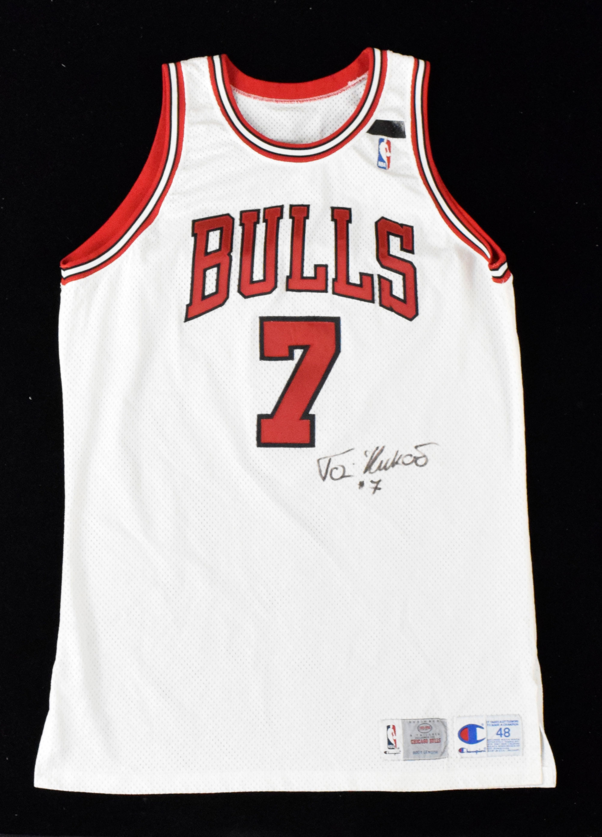 Description:1993-94 Toni Kukoc autographed Chicago Bulls jersey - professional quality (EX/MT) White mesh jersey has "Bulls" team name across the front with number "7" below. Number also appears on back along with the name, "Kukoc." Champion tag on the left front tail notes size (48) and is next to the "Designed & Tailored Exclusively for Chicago Bulls" year tag ("1993-1994") which also reads "Body Length +4." Signed on the front in black marker rating 8 out of 10. Use/wear throughout. While the jersey appears to be tagged in similar manner to those which were issued to players/team we are unaware if this particular jersey was intended for Rodman: EX ($500-$750)