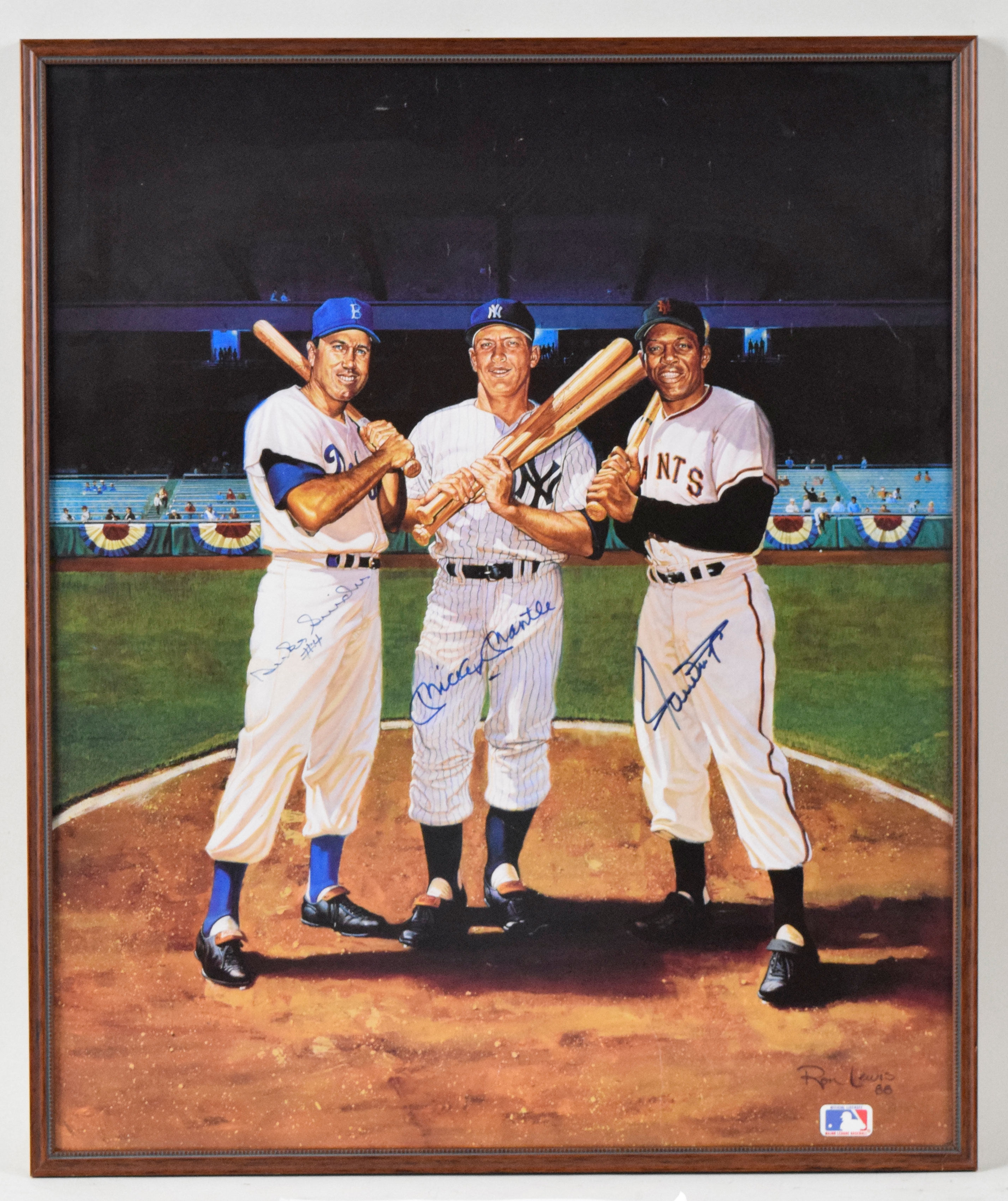 Description:Mickey Mantle, Willie Mays, and Duke Snider autographed print (EX-NM) Nicely done poster/print has been signed by all (3) in marker rating 8 to 9/10 out of 10. Framed to 21"x25" for display with a touch of light evident wear: EX-NM ($300-$500)