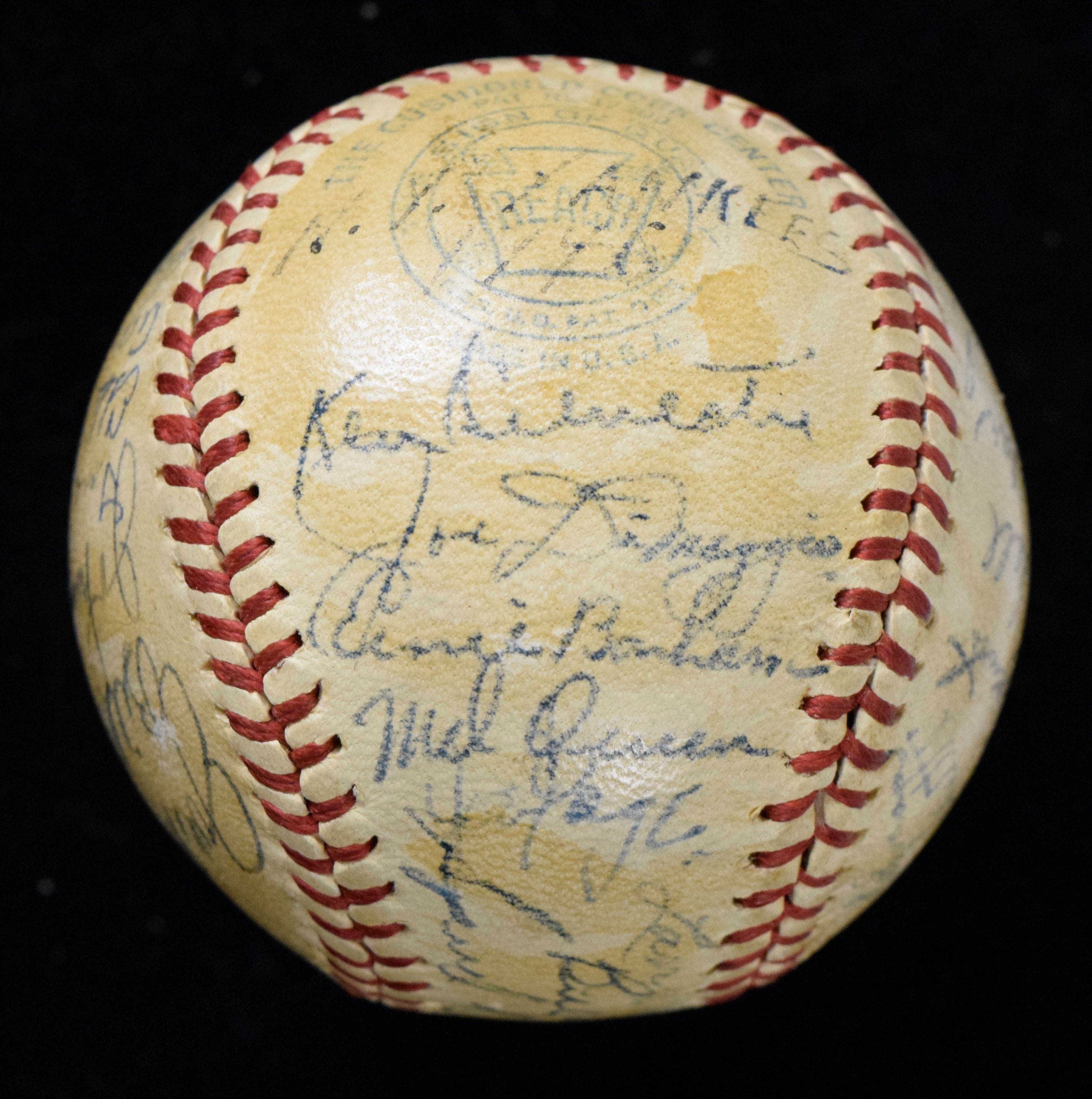 Description:1946 New York Yankees team signed baseball with (5) Hall of Famers incl. DiMaggio (full JSA LOA) (EX-EX/MT) Reach W.Harridge Official American League baseball has been signed by (32) incl. Joe DiMaggio, Yogi Berra, Bill Dickey, Phil Rizzuto, Joe Gordon, Joe Page, Snuffy Stirnweiss, Karl Drews, Charlie Keller, Tiny Bonham, Vic Raschi, and others. Fountain pen signatures rate 7 to 7/8 out of 10. Ball has a toned coat of shellac applied and a year/team identifier written over stampings. Includes full LOA from JSA: EX-EX/MT ($500-$750)