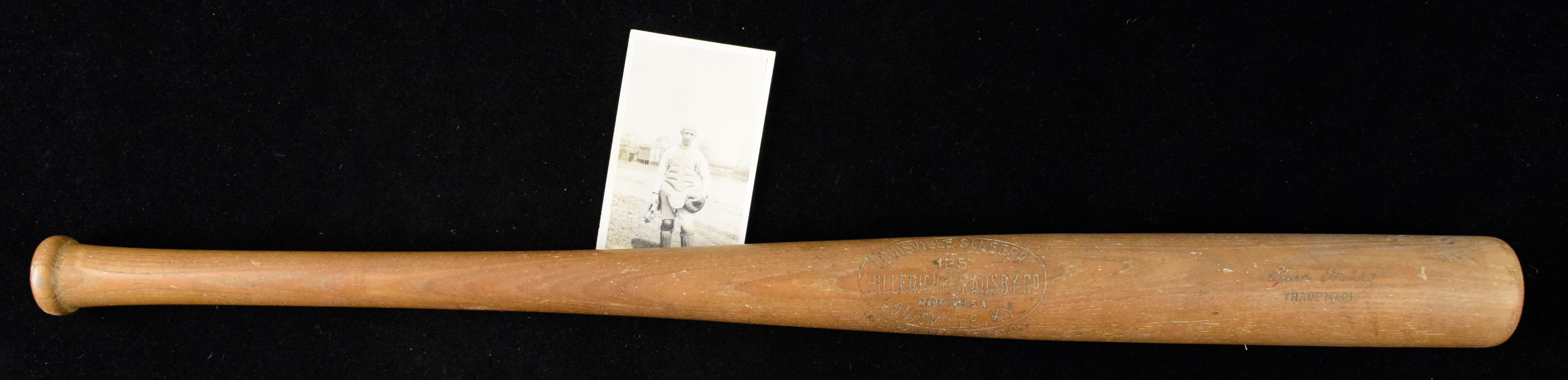 Description:c.1920s Steve O'Neill professional model baseball bat with vintage O'Neill photograph (EX) 34.5" Louisville Slugger 125 Steve O'Neill model bat weighing a lofty 45-oz. Visible use with grain swelling on the barrel, along with a few chips and scuff marks: EX ($500-$1,000)