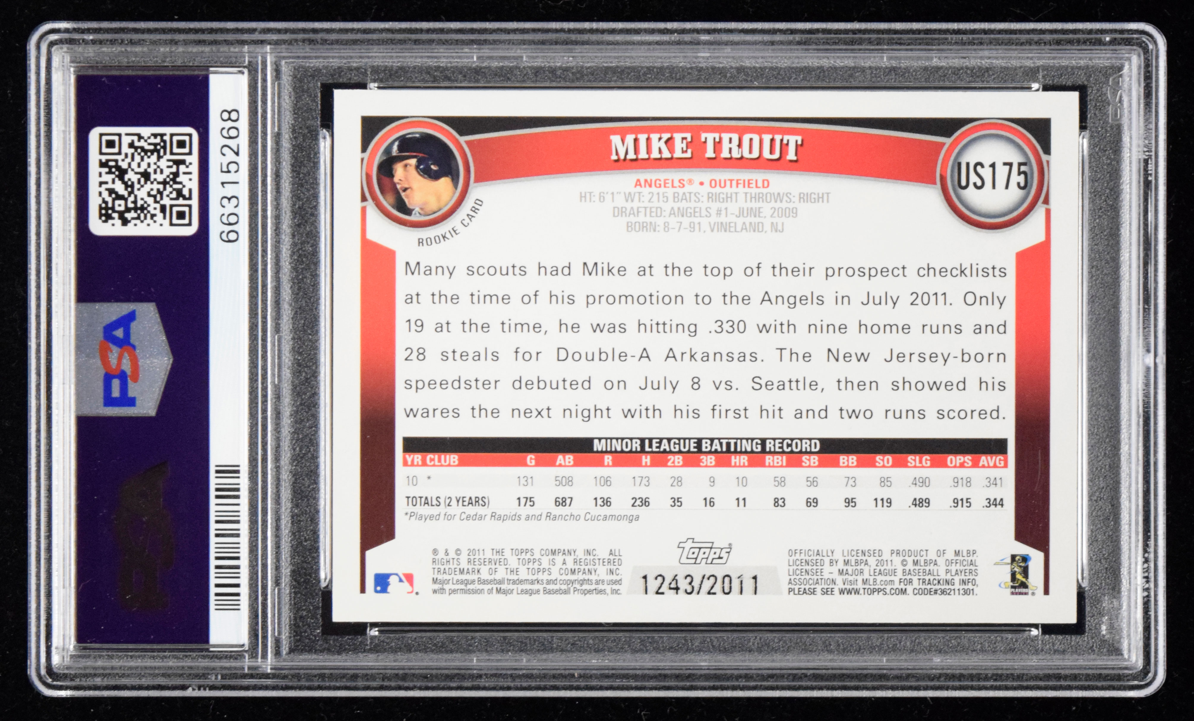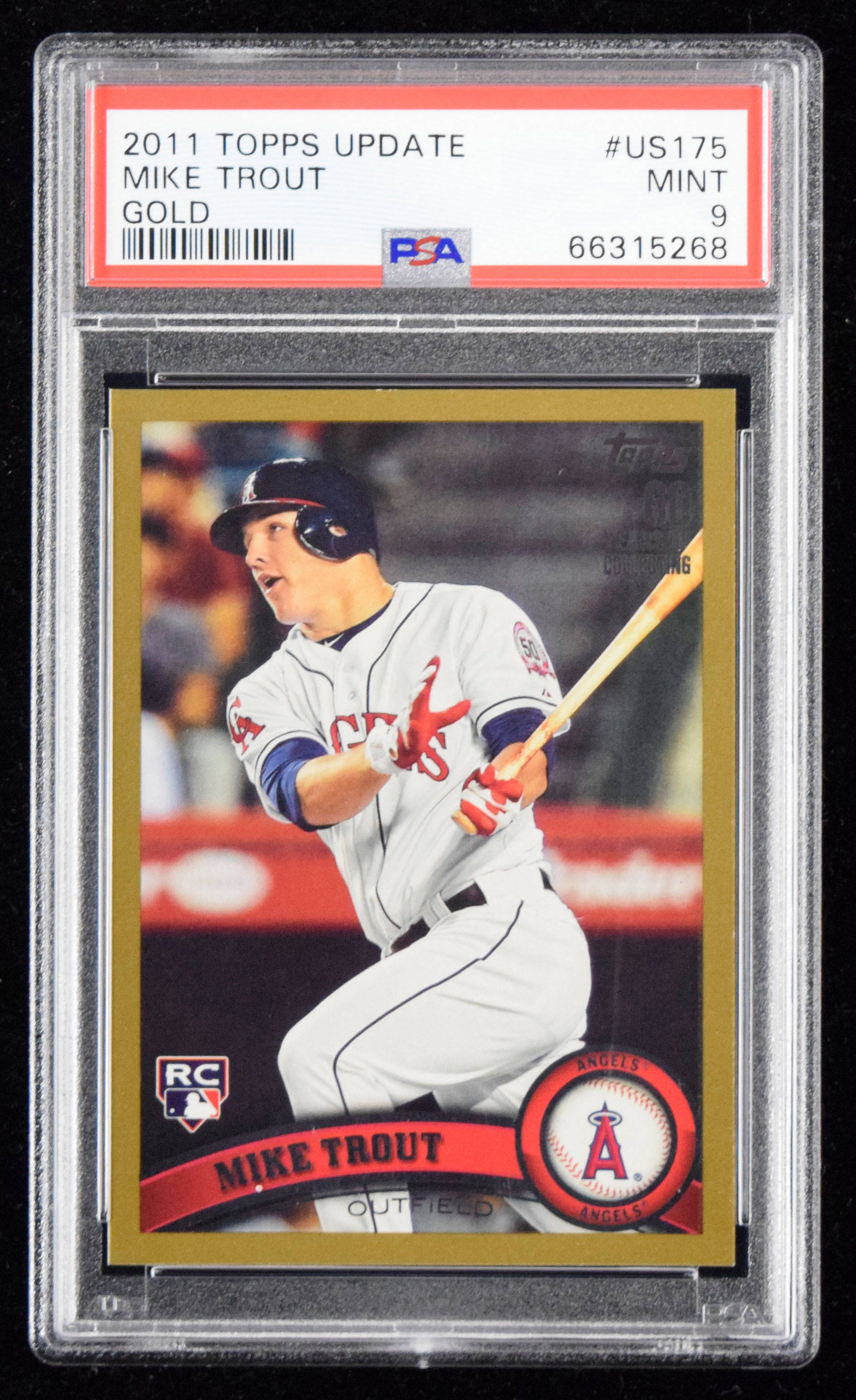 Description:2011 Topps Update #US175 Mike Trout Gold Rookie (1243/2011) (PSA Mint 9) Defining modern era Rookie card is the gold parallel, serial numbered out of (2,011). Pack fresh condition and virtually unimprovable: PSA Mint 9 ($3,000-$5,000)