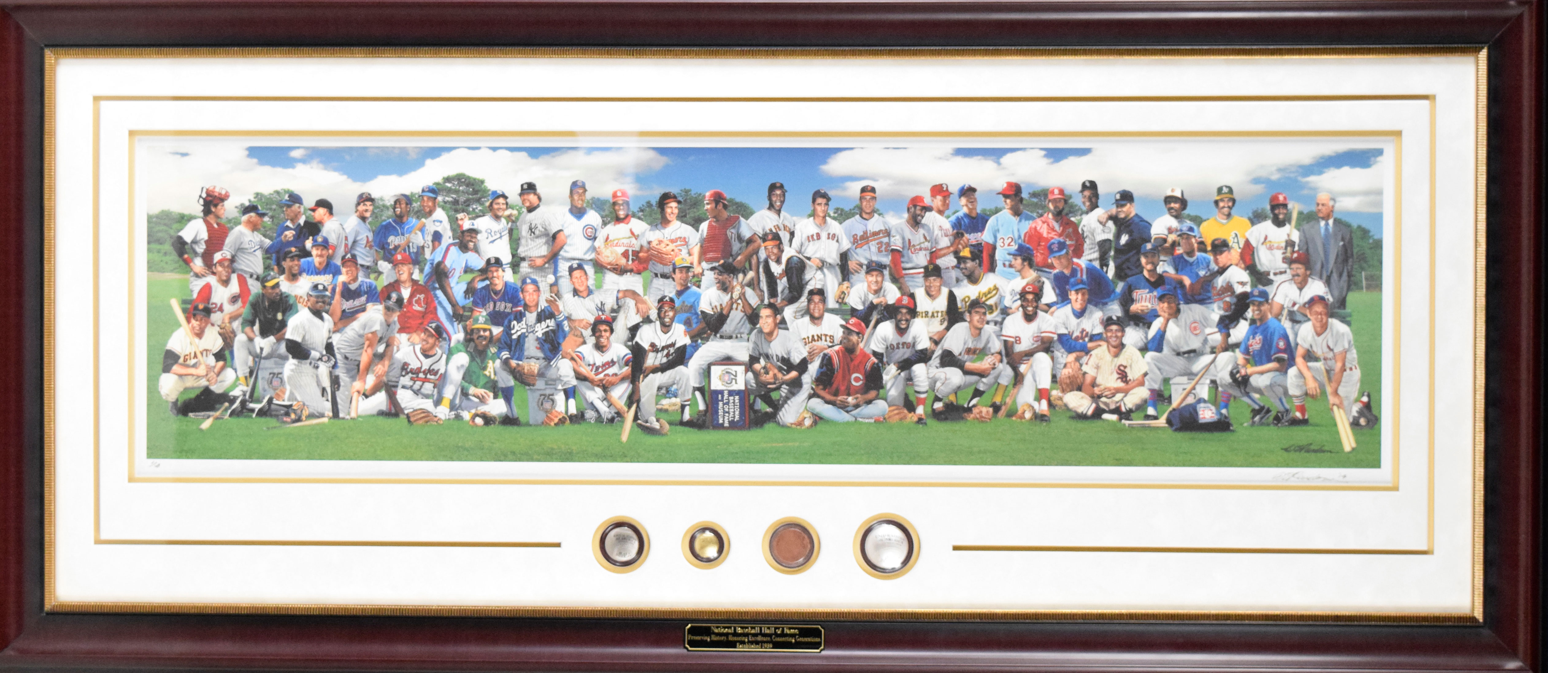 Description:Baseball Hall of Fame 75th Anniversary limited edition print ("1/4") framed with set of (3) commemorative coins incl. $5 gold piece (NM) Panoramic style framed display (25"x58") houses a print done by Bill Purdom (signed and numbered 1/4) to commemorate the 75th Anniversary of the Hall of Fame. Within the matting below is a set of (3) United States Mint issued proof coins done in 2014 including a $5 gold piece, silver dollar, and clad half dollar. There is a capsule of dust taken from bricks removed from the Hall. No mentionable wear. Includes original paperwork: NM ($750-$1,000)