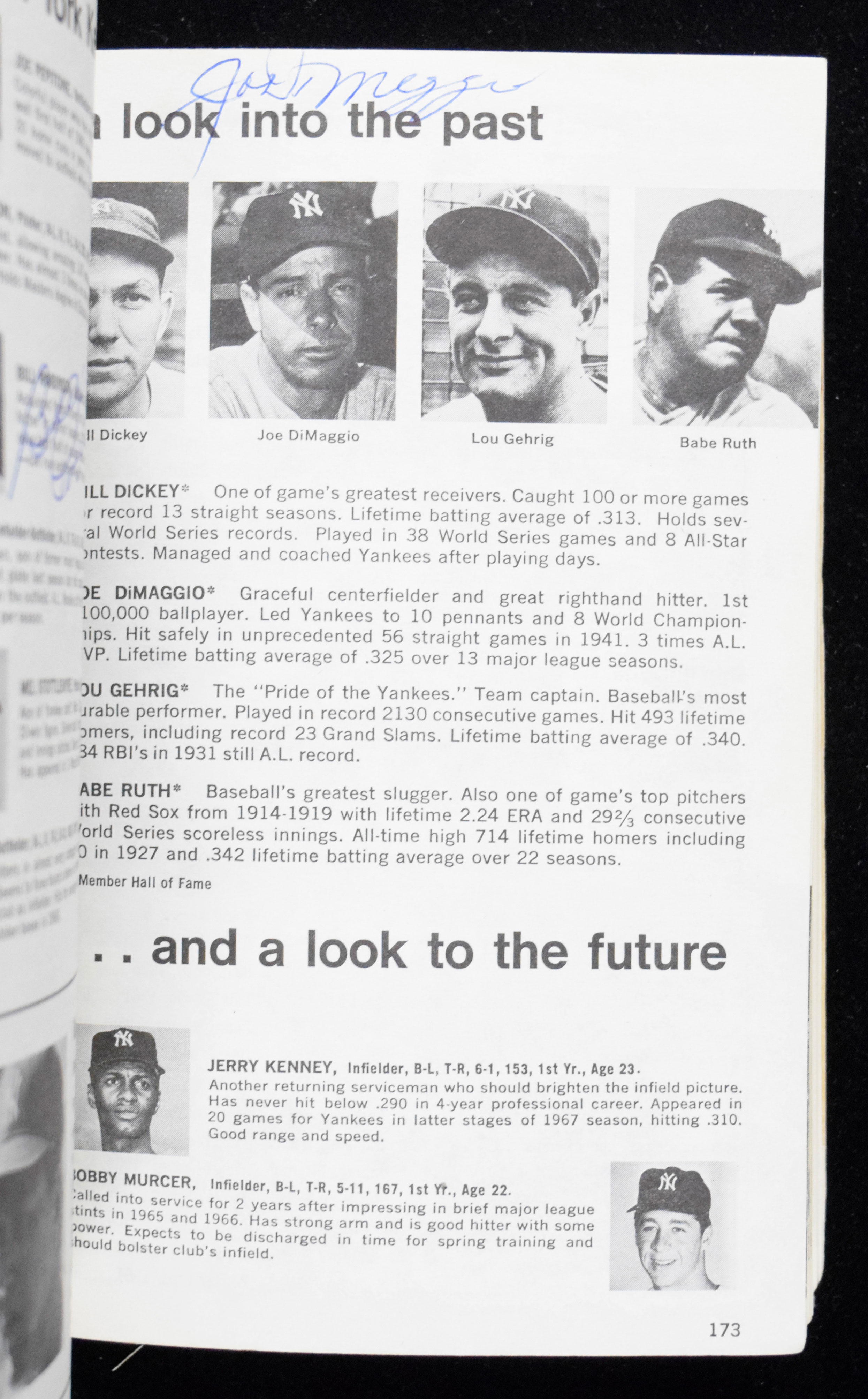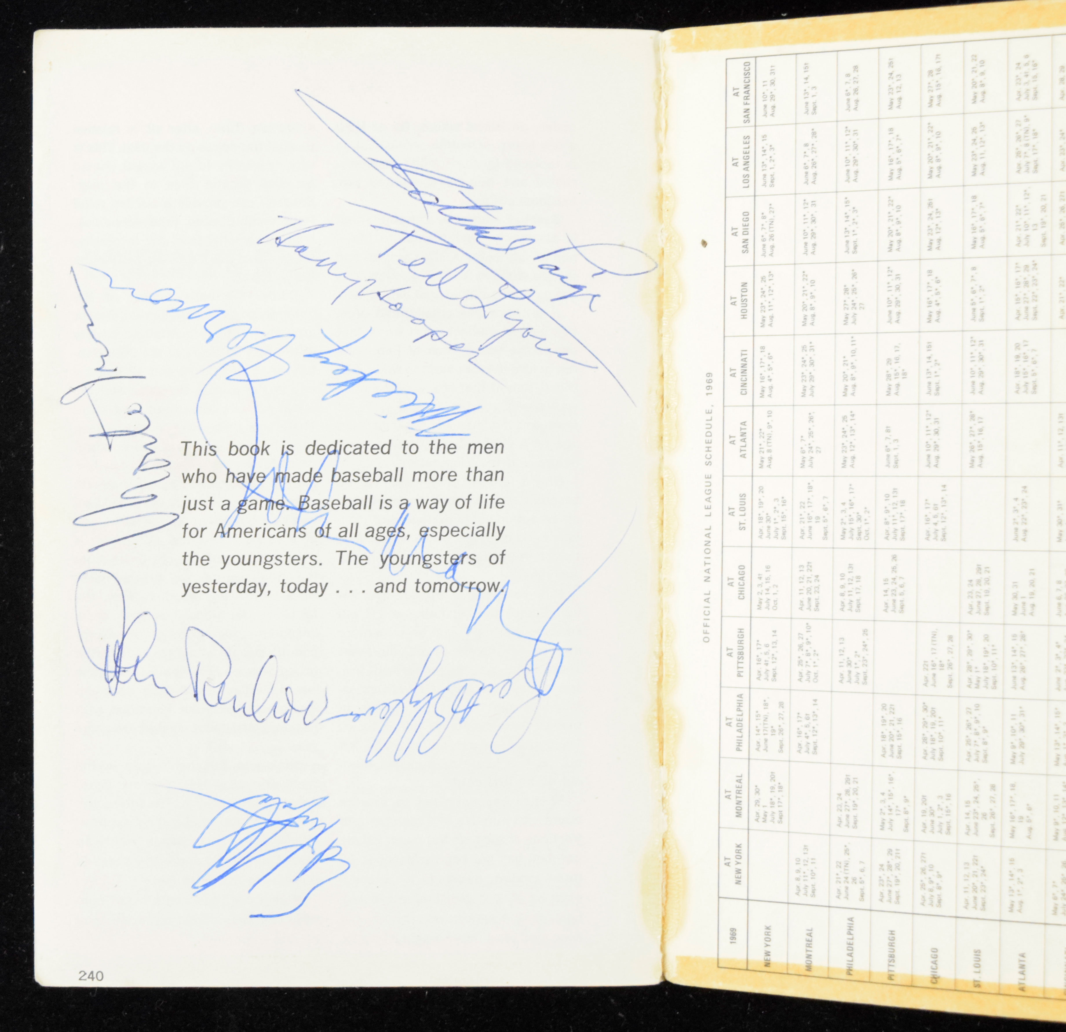 Description:"Baseball The First 100 Years" book with (46) autographs including (26) Hall of Famers (Sigs. VG-NM, Book GD/VG) Softcover vintage publication has been signed throughout the interior by (46) incl. Satchel Paige, Joe DiMaggio, Bowie Kuhn, Chub Feeney, Casey Stengel, Gene Alley, Stan Musial, Warren Spahn, Nelson Fox, Bill Terry, Joe Medwick, Luke Appling, Dave McNally, Boog Powell, Earl Weaver, Dick Williams, Joe Cronin, Bob Feller, Charles Gehringer, Hank Greenberg, Sam Rice, Tommy John, Tony Oliva, Lefty Grove, Waite Hoyt, Rube Marquard, Ted Lyons, Harry Hooper, Mickey Vernon, Monte Irvin, Bert Blyleven, and others. Ink signatures rate 6/7 to 8/9 out of 10. Mild general handling wear with some staining/tape residue to covers: Sigs. VG-NM, Book GD/VG ($300-$500)