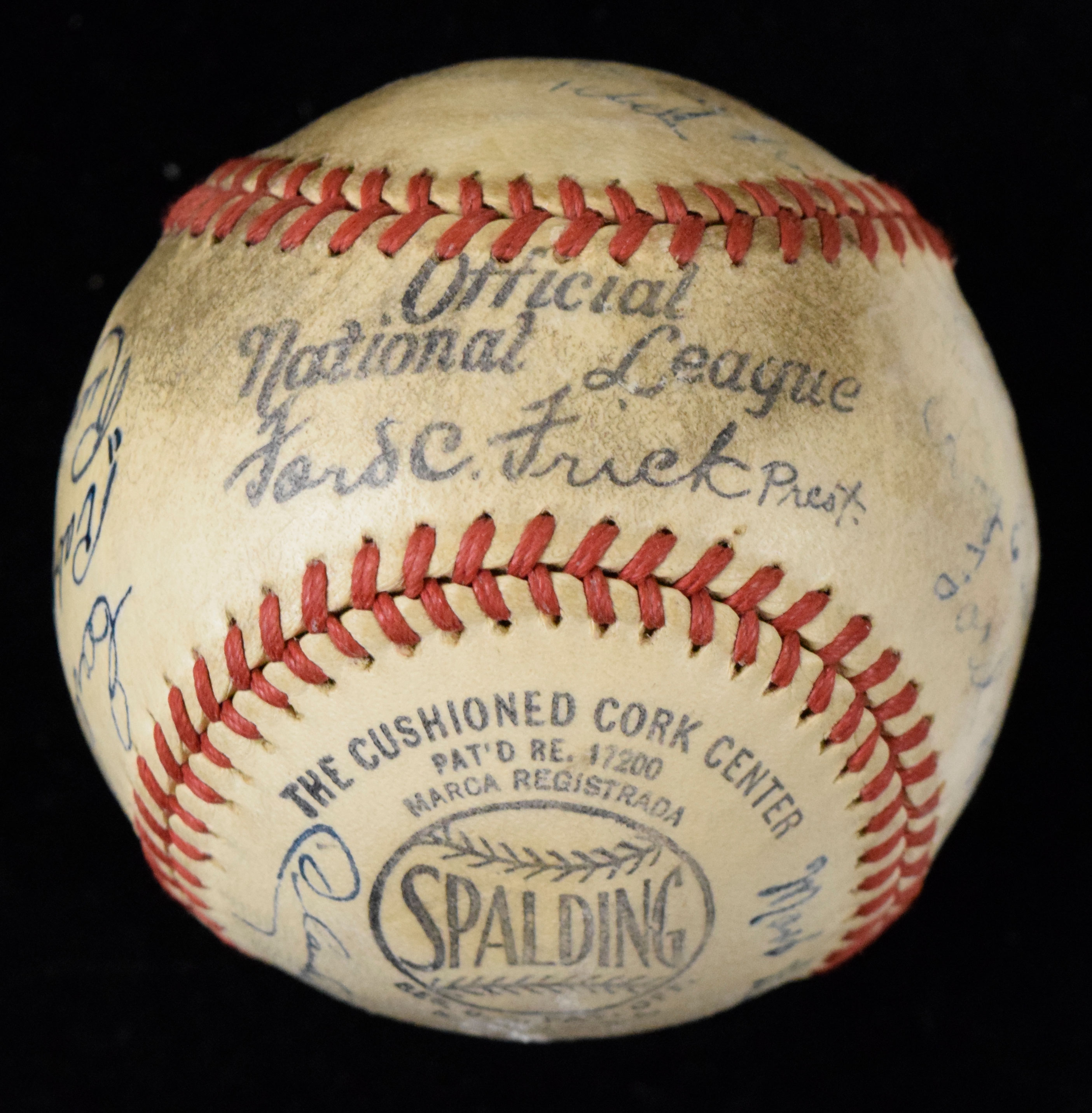 Description:1942 Fort Worth Cats team signed baseball with Rogers Hornsby (Ball VG-EX, Sigs. VG-EX/MT) Spalding F.Frick Official National League baseball (with Texas League commissioner stamp on side panel) has been signed by (17) including Manager Rogers Hornsby across the sweetspot. Fountain pen signatures generally rate 6 to 7 out of 10 with a few stronger. Ball has a brown stain on the side panel and a larger area of soiling which is not visible when the Hornsby signature is displayed: Ball VG-EX, Sigs. VG-EX/MT ($500-$750)
