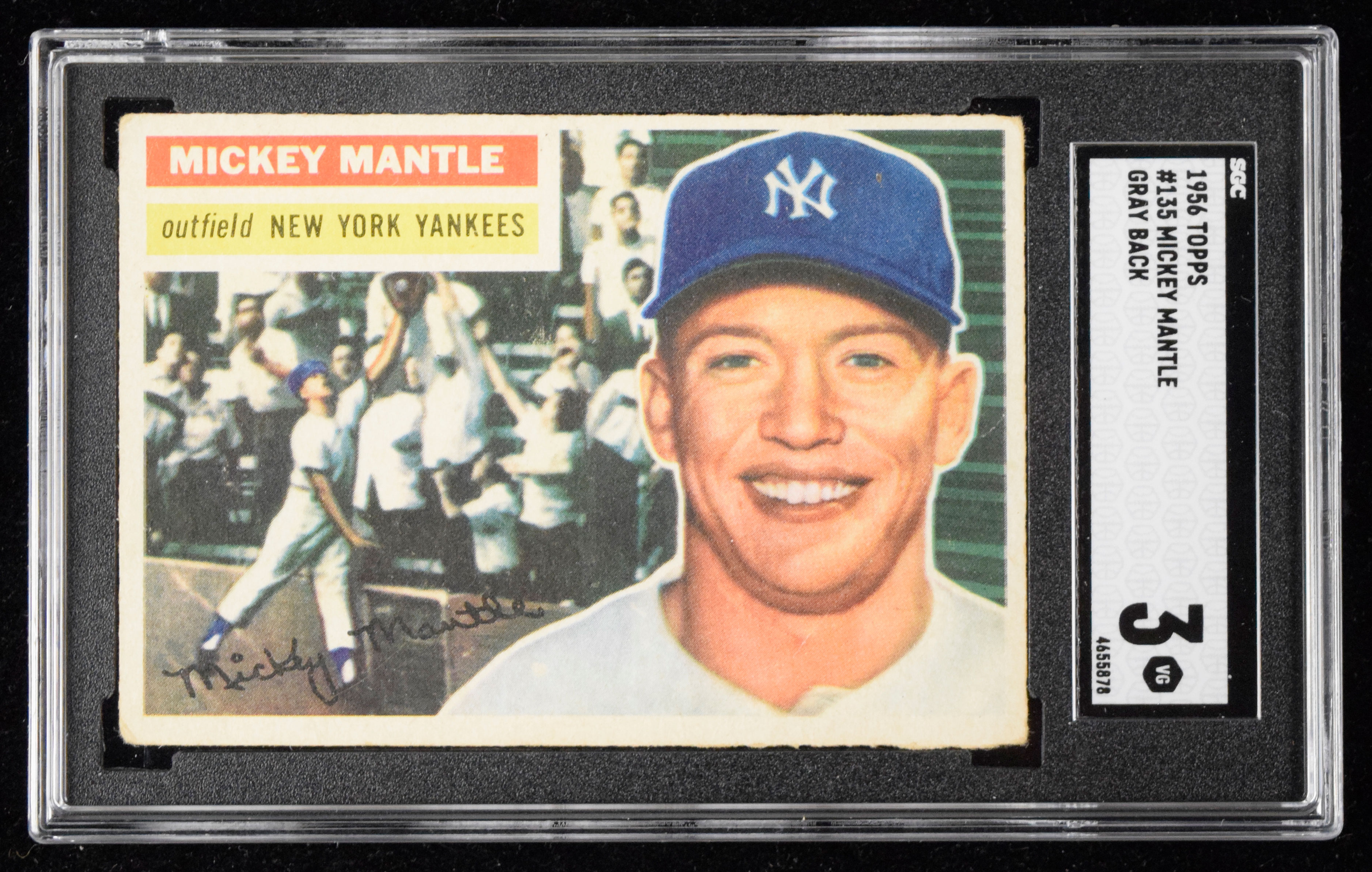 1956 Topps #135 Mickey Mantle (Gray back) (SGC 3 VG) Classic Mantle card shows a touch of light wear with small wrinkle on lower edge: SGC 3 VG ($750-$1,250)