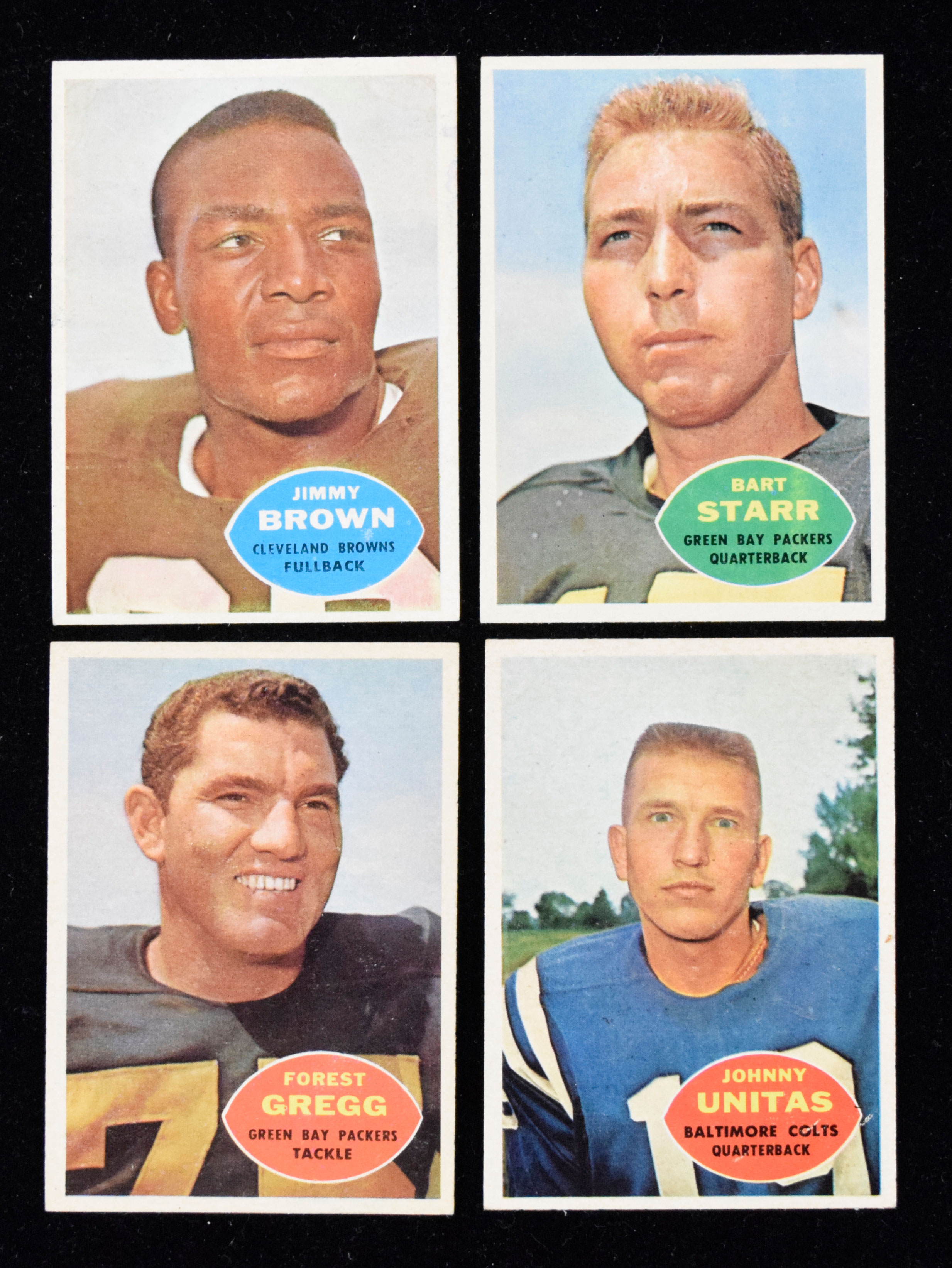 Description:1960 Topps Football complete set (132 cards) (Avg. EX or better) #1 Johnny Unitas (EX, very minor print defect), #23 Jim Brown (EX-EX/MT OC however there appear to be some minor moisture stains), #51 Bart Starr (EX-EX/MT), #56 Forest Gregg RC (EX-EX/MT), #74 Frank Gifford (VG), #80 Sam Huff (ENM OC), #87 Chuck Bednarik (wax on front and there are two lines of discoloration that would likely remain after wax removed), #93 Bobby Layne (EX/MT-NM OC), and #113 Y.A. Tittle (VG/EX-EX): Avg. EX or better ($400-$600)