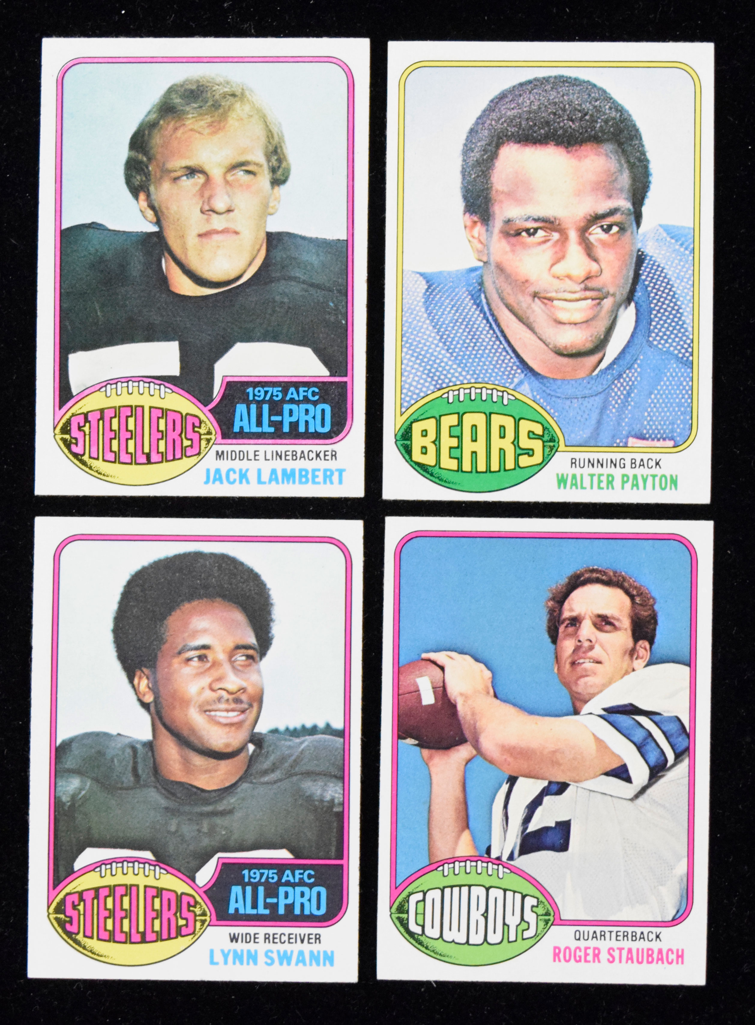 Description:1976 Topps Football complete set (528 cards) plus duplicates (Set avg. NM) Keys: #75 Bradshaw (NM slightly OC), 148 Swnn (NM slightly OC), 148 Payton (EX/MT), 158 White (NM), 220 Lambert (EX), 395 Staubach (NM slightly OC), and 427 Jones (NM, minute print defect). Average NM condition with EX-NM general and there are some duplicates included which generally grade a touch lesser: Set. avg. NM ($500-$750)