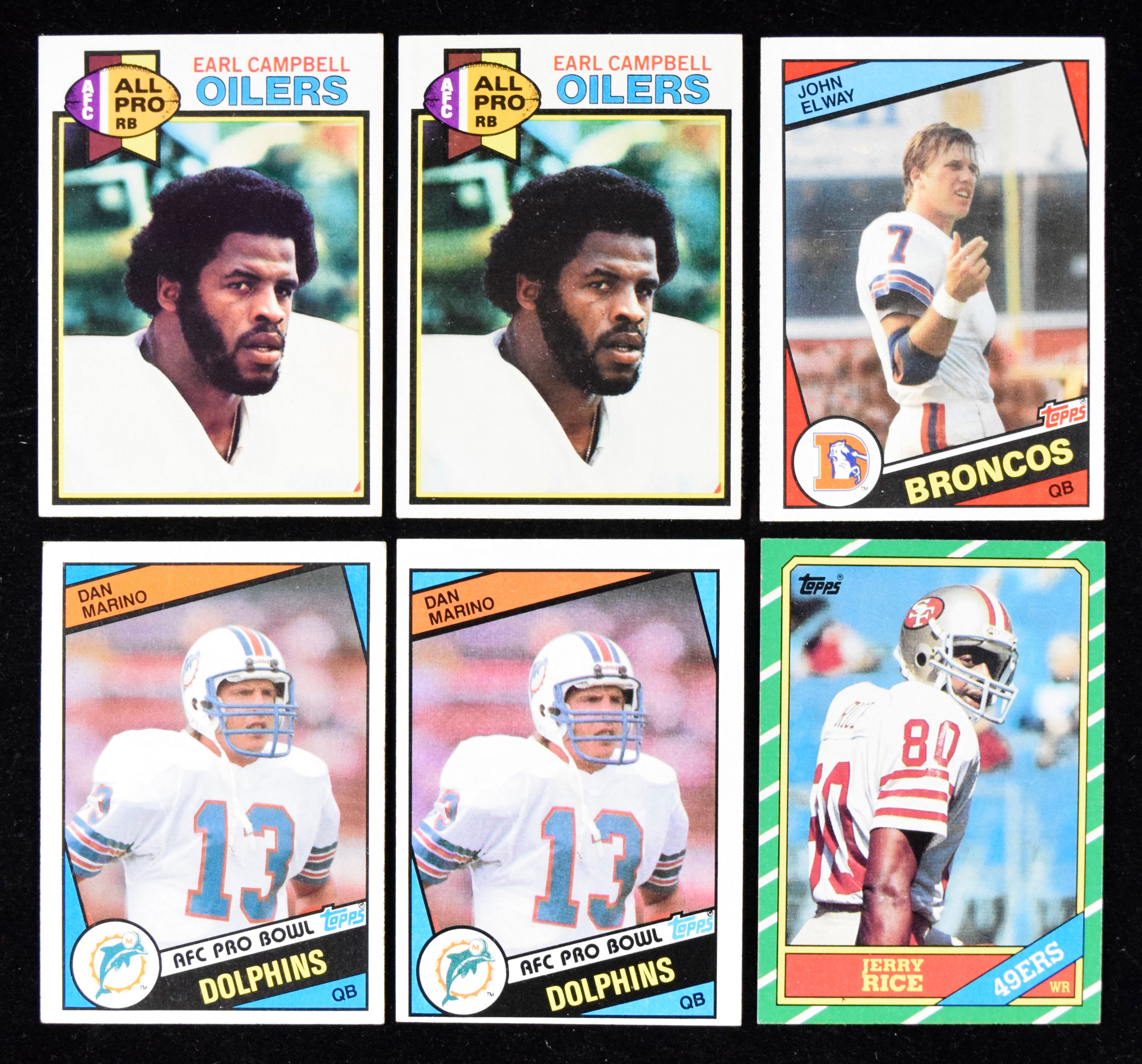 Description:Lot of (6) 1979-1984 Topps RCs, with Jerry Rice and (2) Dan Marino (EX-NM). Nice lot of key rookies from the late 1970s-mid-1980s, with (2) 1979 Topps #390 Earl Campbell RCs (EX/MT); (2) 1984 Topps #123 Dan Marino RCs (EX, EX/MT OC); 1984 Topps #63 John Elway RC (EX) and 1986 Topps #161 Jerry Rice RC (NM). Range: EX-NM.