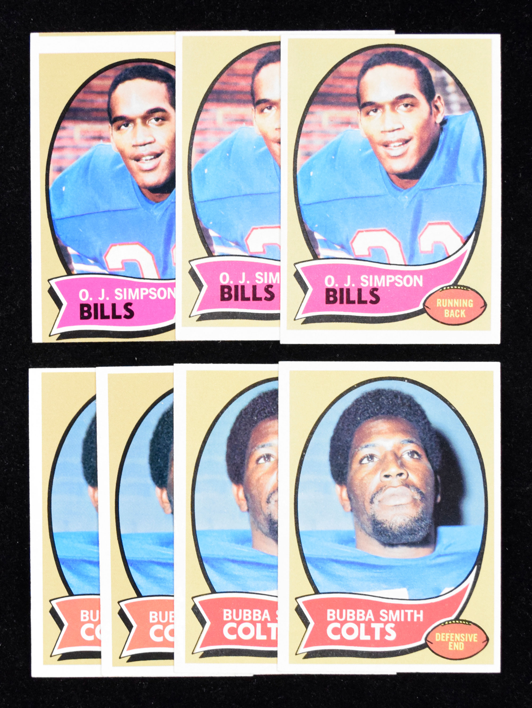 Description:Lot of (7) 1970 Topps football RCs, with (3) O.J. Simpson & (4) Bubba Smith (EX miscut-NM OC). Nice lot of key rookies from the 1970 Topps set, with (3) #90 O.J. Simpson RC (NM OC, EX/MT OC & EX miscut), and (4) #114 Bubba Smith RC (EX/MT, EX/MT, NM OC & EX/MT OC. Range: EX miscut-NM OC.