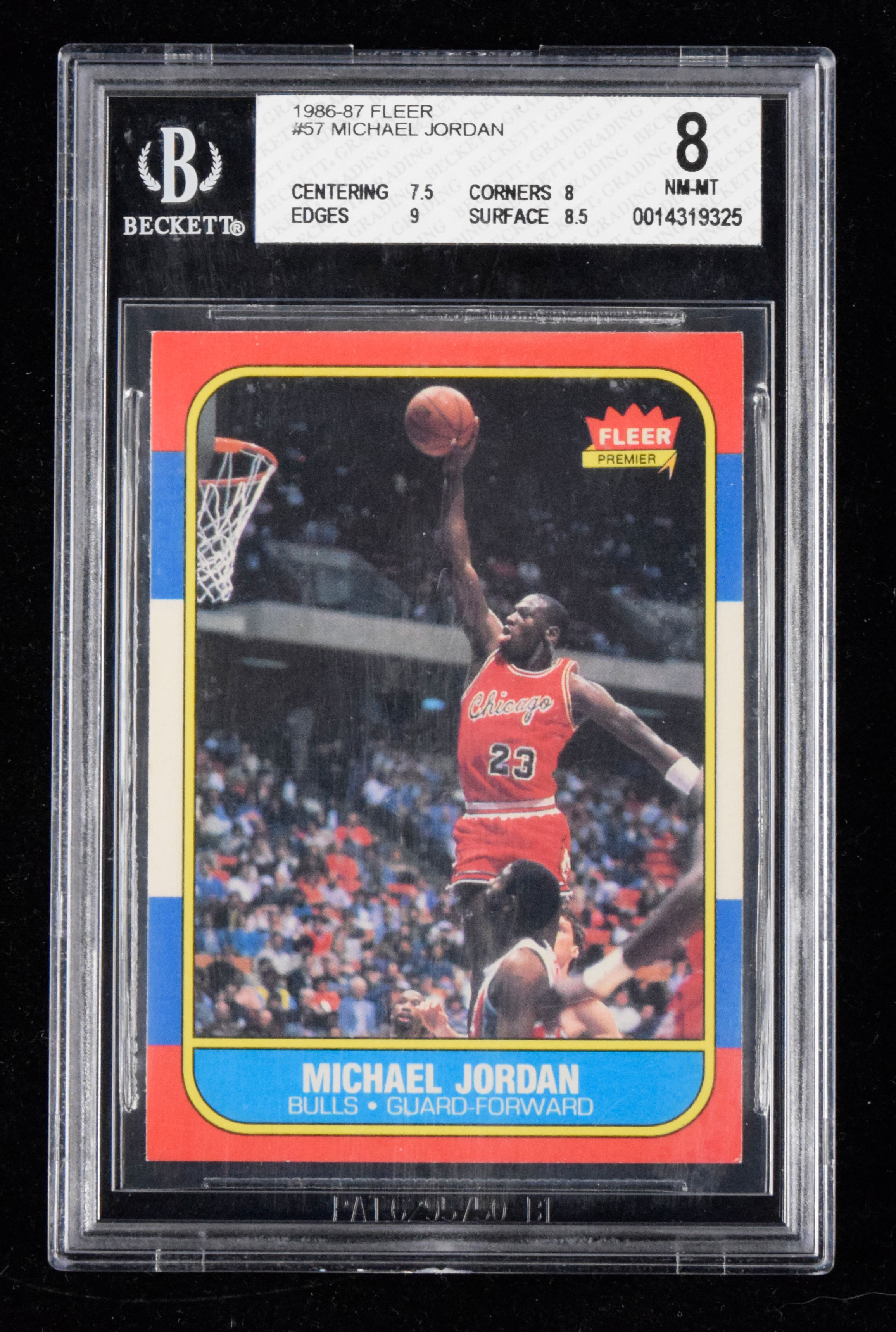 Description:1986-87 Fleer #57 Michael Jordan Rookie (BGS 8 NM-MT) Iconic Rookie card is in highly collectible condition with all subgrades (8) or better with the exception of centering (7.5): BGS 8 NM-MT ($3,000-$5,000)