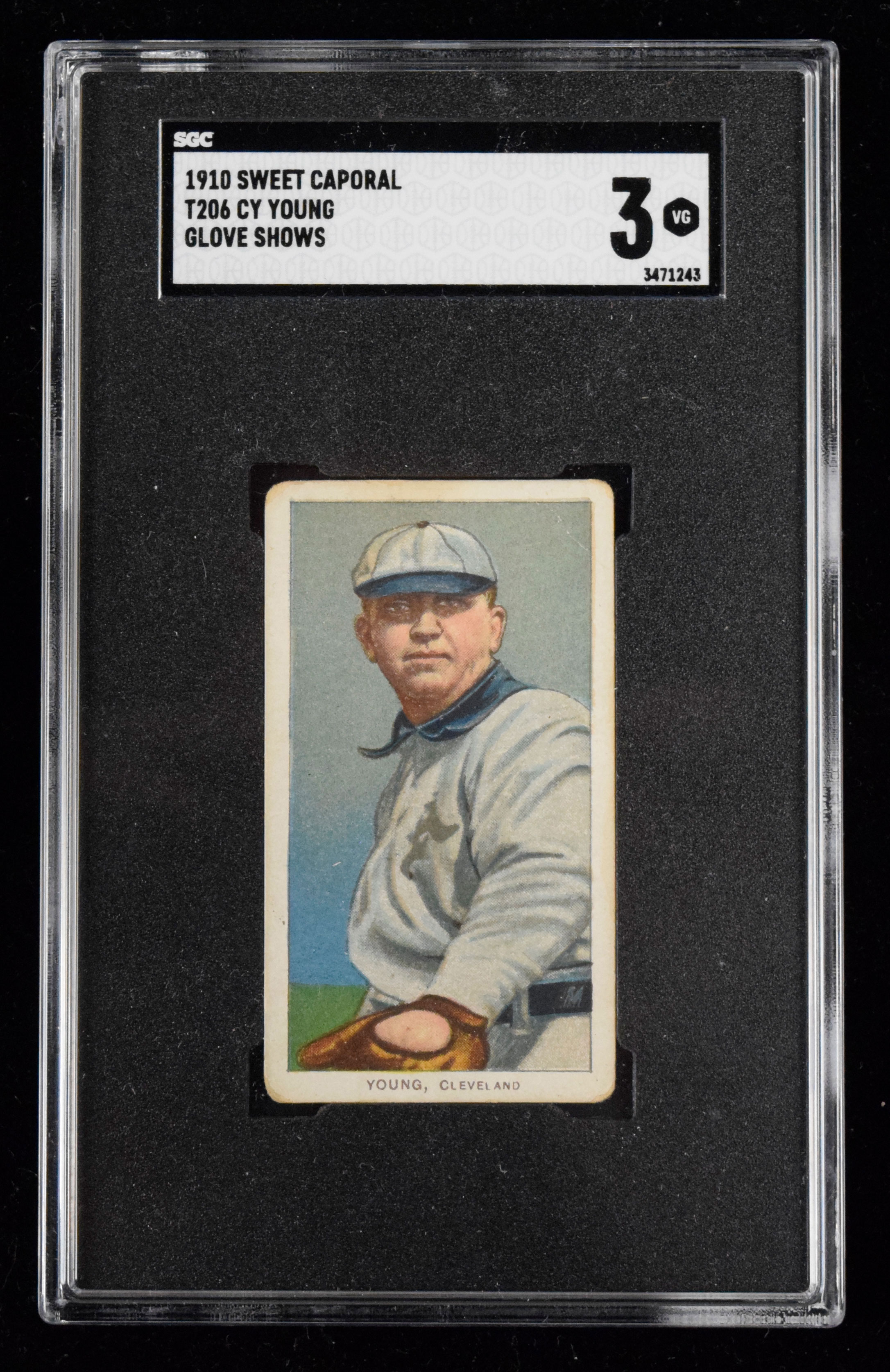 Description:1909-11 T206 Sweet Caporal Cy Young (Glove shows) (SGC 3 VG) Well centered with corner wear and a small crease to upper right: SGC 3 VG ($2,000-$2,500)