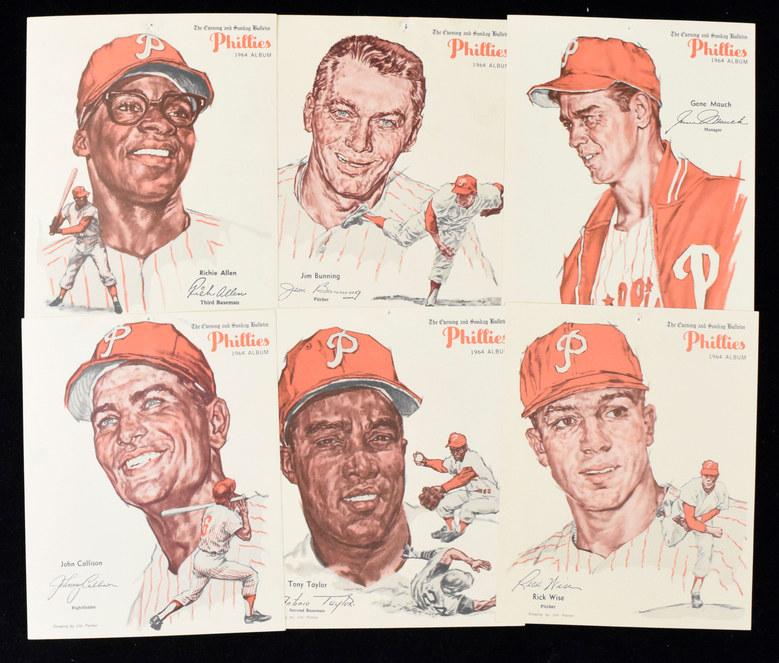 Description:Philadelphia Bulletin 1964 Philadelphia Phillies premiums set (see description). Complete set of (27) including Jim Bunning, Dick Allen, etc. Most remain crease free, with fairly minor corner/edge wear, but all have tack holes at the top edge.