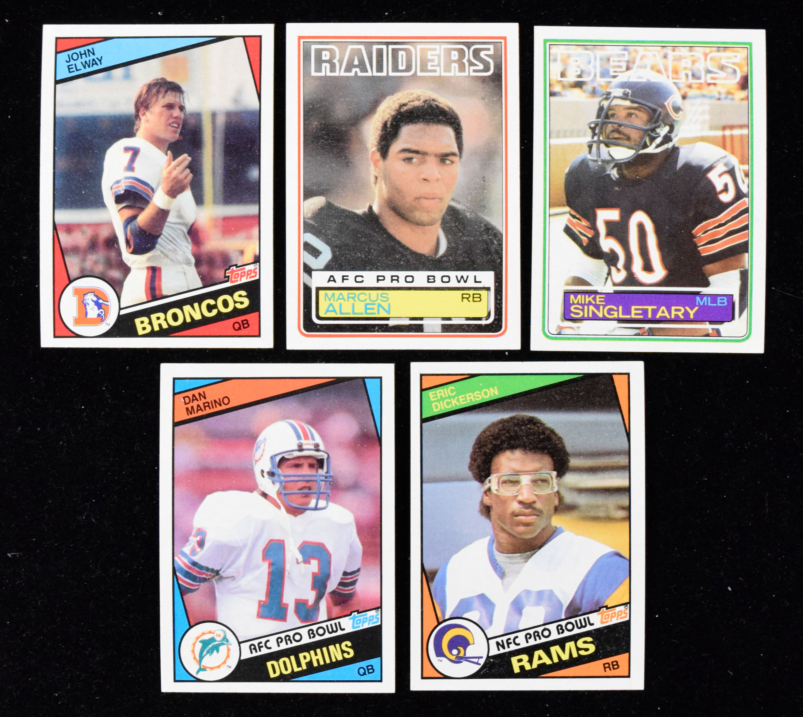 Description:1983 and 1984 Topps Football card sets (NM-NM/MT overall). Includes 1983 Topps set with #s 38 Mike Singletary rookie (NM) and 294 Marcus Allen rookie (NM-NM/MT); and 1984 Topps set with #s 63 John Elway rookie (NM), 123 Dan Marino rookie (NM-NM/MT), and 280 Eric Dickerson rookie (NM). Remainder appear to average NM-NM/MT overall.