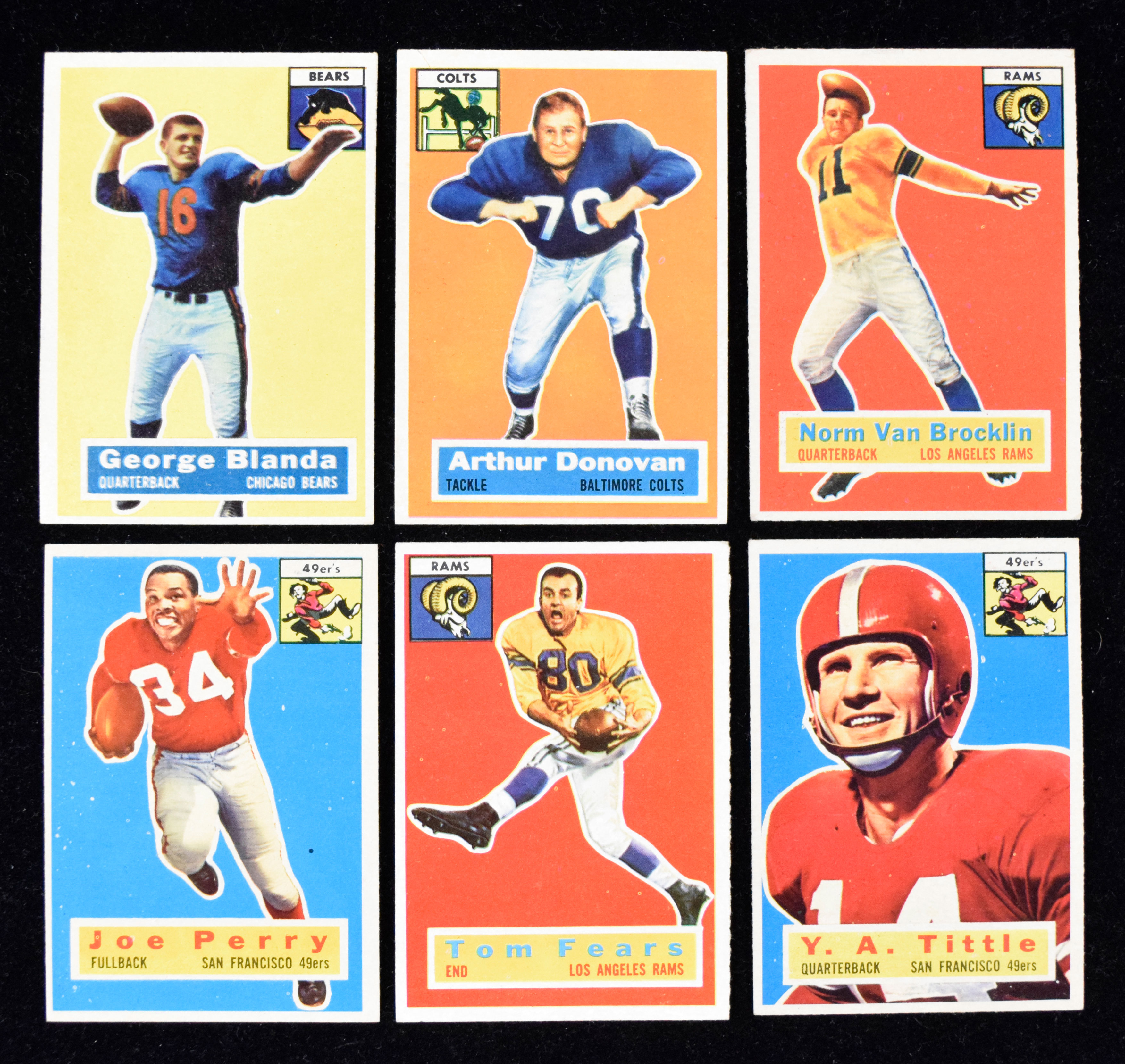 Lot of (54) 1956 Topps Football cards including HOFers (VG-NM). Includes #s 1, 3, (2) 6 Norm Van Brocklin, 8 Lou Creekmur, 10, 11 George Blanda, (2) 12, 13, 14, (2) 23, (3) 24, 26, 30 Les Richter, 35, (2) 36 Donovan, 37, 42 Tom Fears, 46, 47 Bill George, (2) 48, 56, 57, 58 Ollie Matson, (2) 59, 68, 69, 70, 71 Stan Jones, 72, 77, 80, 82, 83, (2) 86 Y.A. Tittle, 93, 102, 103 Bobby Dillon, 105 Mike McCormack, 106, 108, 109, 110 Joe Perry, 112, 113, and 119. Most cards appear to average VG/EX overall. Range: VG-NM