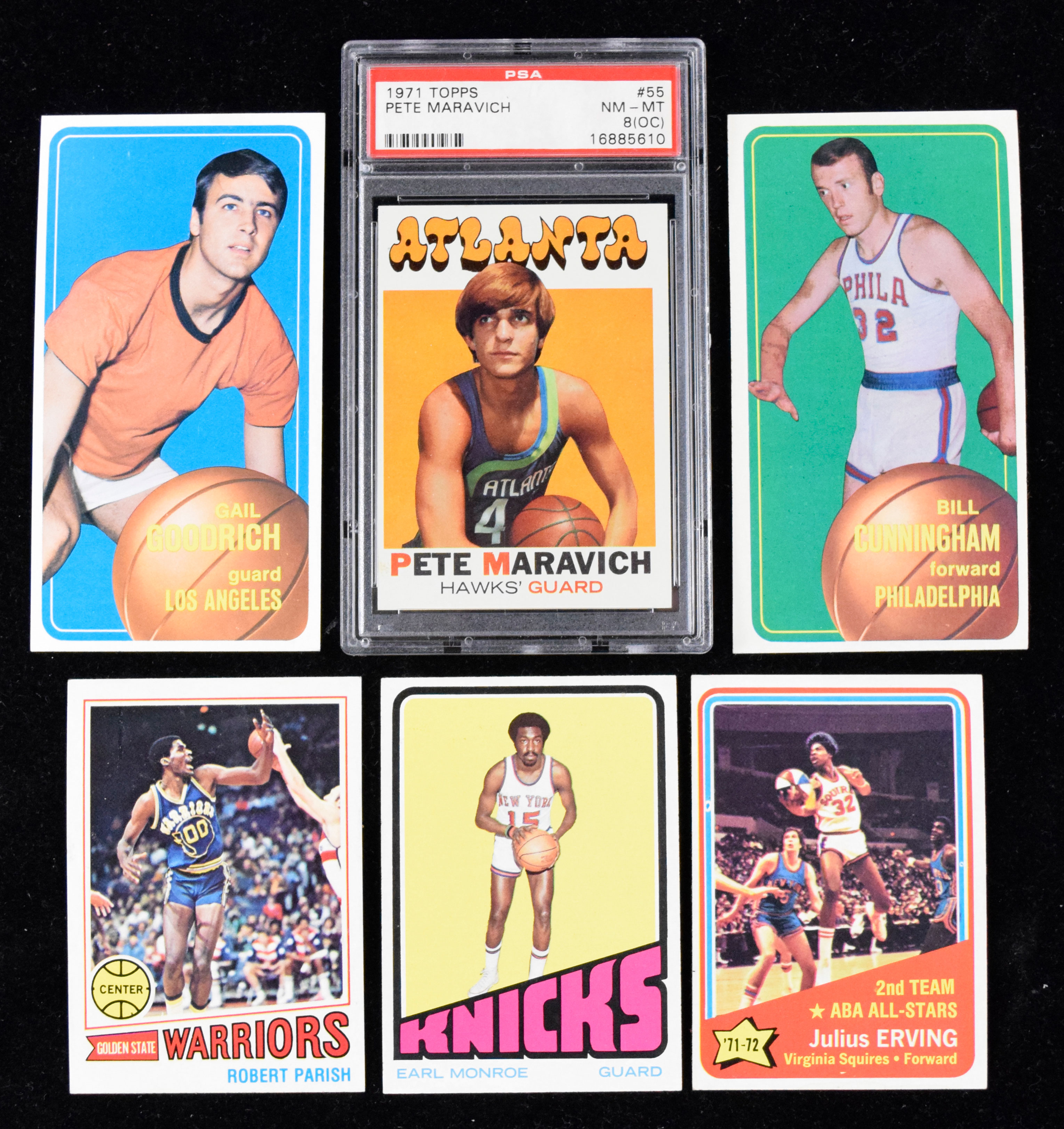 Lot of (26) 1970s basketball cards including graded Maravich (VG-NM/MT). Includes (22) 1970-71 Topps: (2) 12, 28, 33, 35, 47, 57, 73, 74, 72 Wes Unseld, 79, 88, 93 Gail Goodrich, 126, 127, 129, 138, 140 Billy Cunningham, 144, 146, 147, and 152 (avg EX-EX/MT overall); 1971-72 Topps #55 Pete Maravich (PSA 8 NM/MT off-center); 1972-73 Topps #s 73 Earl Monroe (NM), and 255 Julius Erving (EX/MT oc); 1977-78 Topps #111 Robert Parish rookie (EX-EX/MT). Range: VG-NM/MT