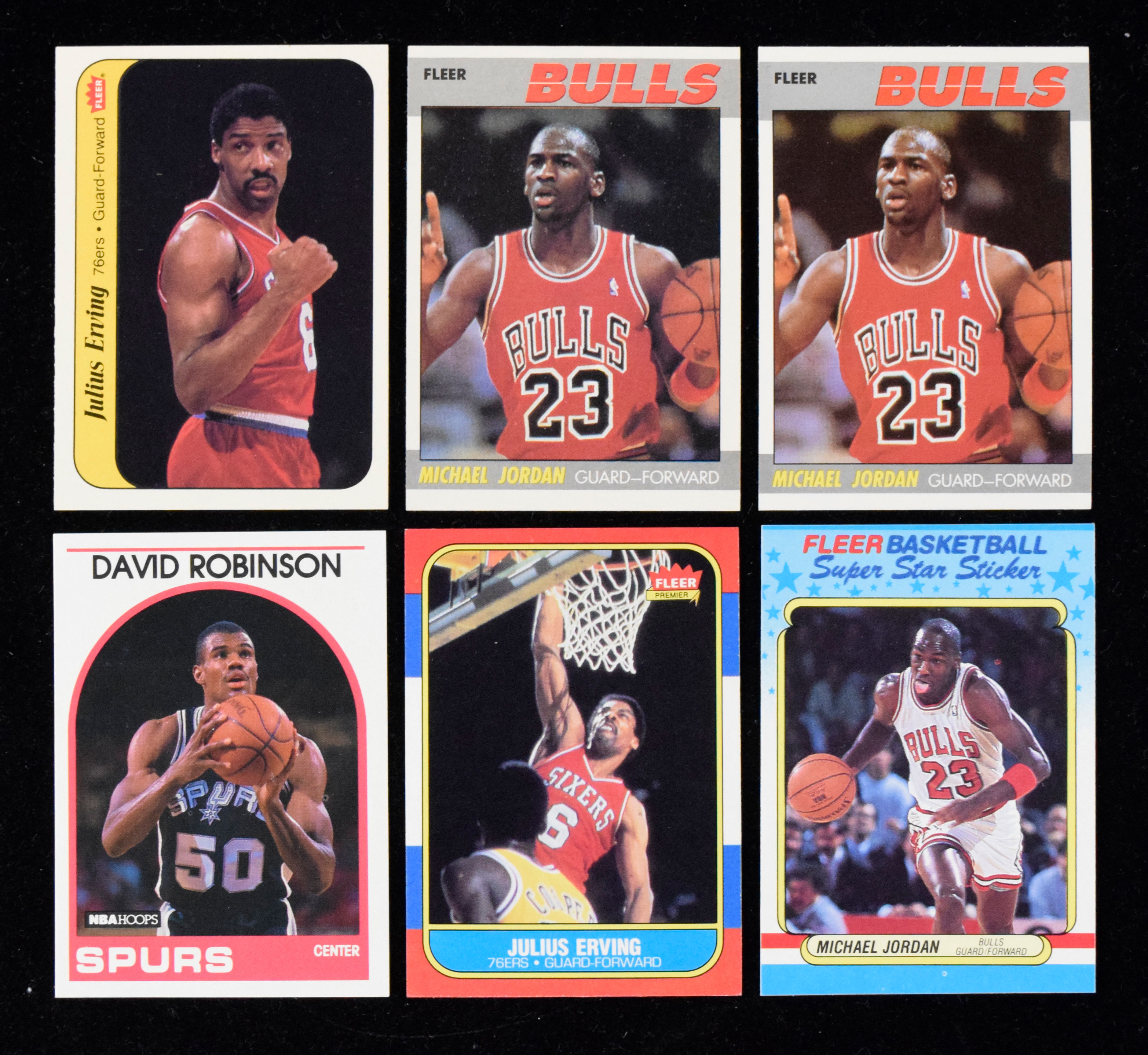 Description:Lot of late 1980s basketball cards including Jordan (GD-NM/MT). Includes 1986-87 Fleer #s (2) 31 Julius Erving, 36 George Gervin, and 132 Jack Sikma; 1986-87 Fleer "Stickers" #5 Erving; (2) 1987-88 Fleer #59 Michael Jordan (EX/MT-NM and NM-NM/MT); 1988-89 Fleer #17 Jordan (GD); 1988-89 Fleer "Stickers" 11-card set (most have wax stains on back); San Antonio Spurs 1988-89 Diamond Shamrock set with David Robinson rookie (with tabs); and (31) 1989-90 NBA Hoops #310 Robinson rookies (NM-NM/MT overall).