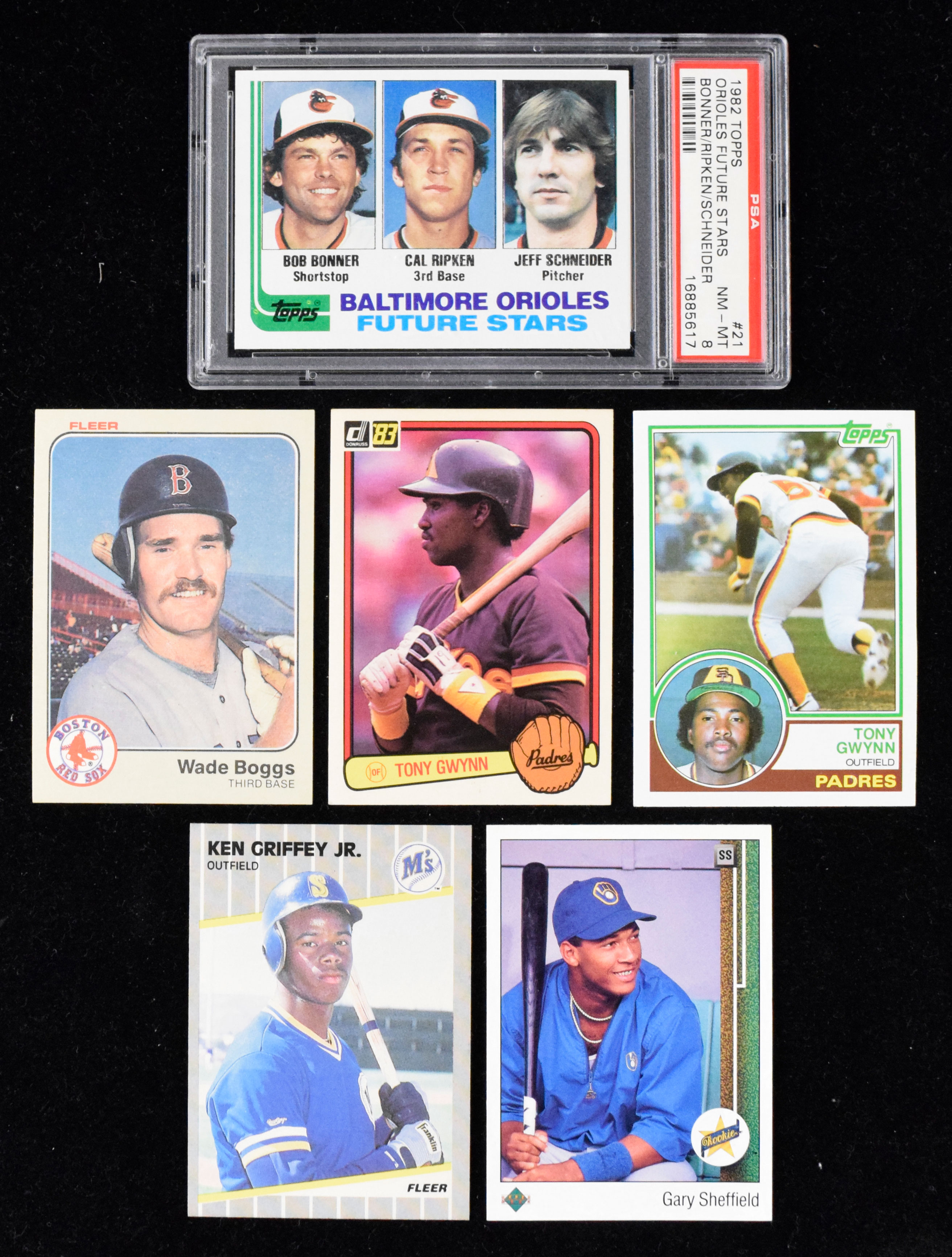 Lot of (20) baseball stars and HOFers rookie cards from 1982-1989 (EX/MT-NM/MT). Includes (2) 1982 Topps #21 Cal Ripken (PSA 6 EX/MT and PSA 8 NM/MT), 1983 Topps #482 Tony Gwynn, (7) 1983 Donruss #598 Gwynn, 1983 Fleer #179 Wade Boggs, (5) 1983 Fleer #360 Gwynn, 1986 Donruss #39 Canseco, 1986 Fleer #649 Canseco, 1989 Fleer #548 Ken Griffey Jr, and 1989 Upper Deck #13 Gary Sheffield. Most cards appear to average NM overall. Range: EX/MT-NM/MT