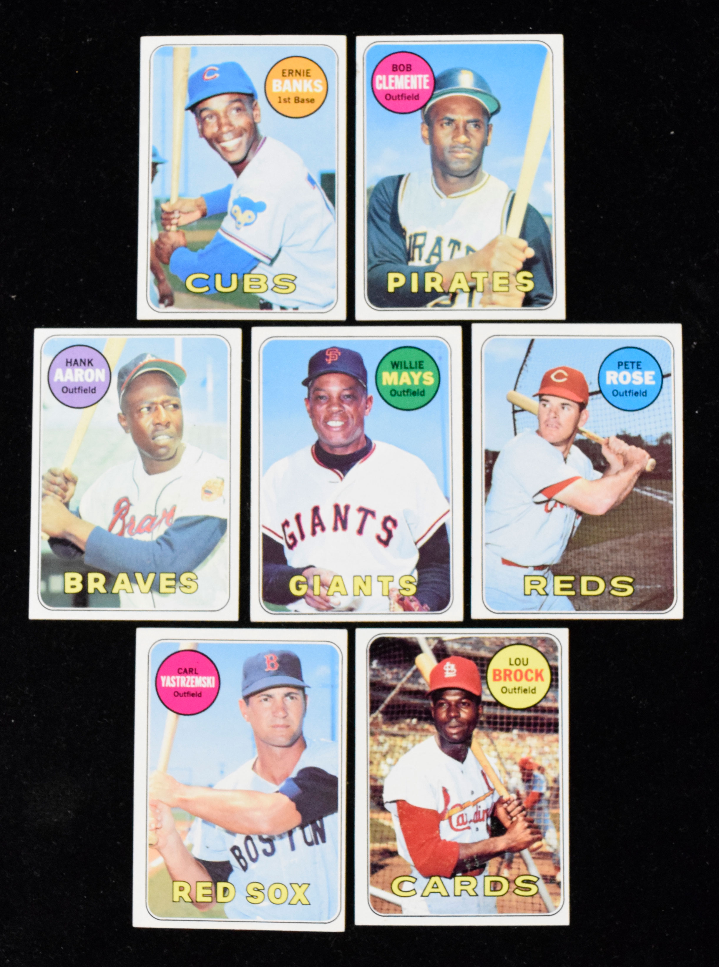 Lot of (7) stars and HOFers 1969 Topps Baseball cards (VG-NM). Includes #s 20 Ernie Banks (EX/MT-NM), 50 Clemente (VG), 85 Lou Brock (EX/MT oc), 100 Hank Aaron (NM), 120 Pete Rose (VG-VG/EX), 130 Carl Yastrzemski (VG/EX oc), and 190 Willie Mays (EX/MT).