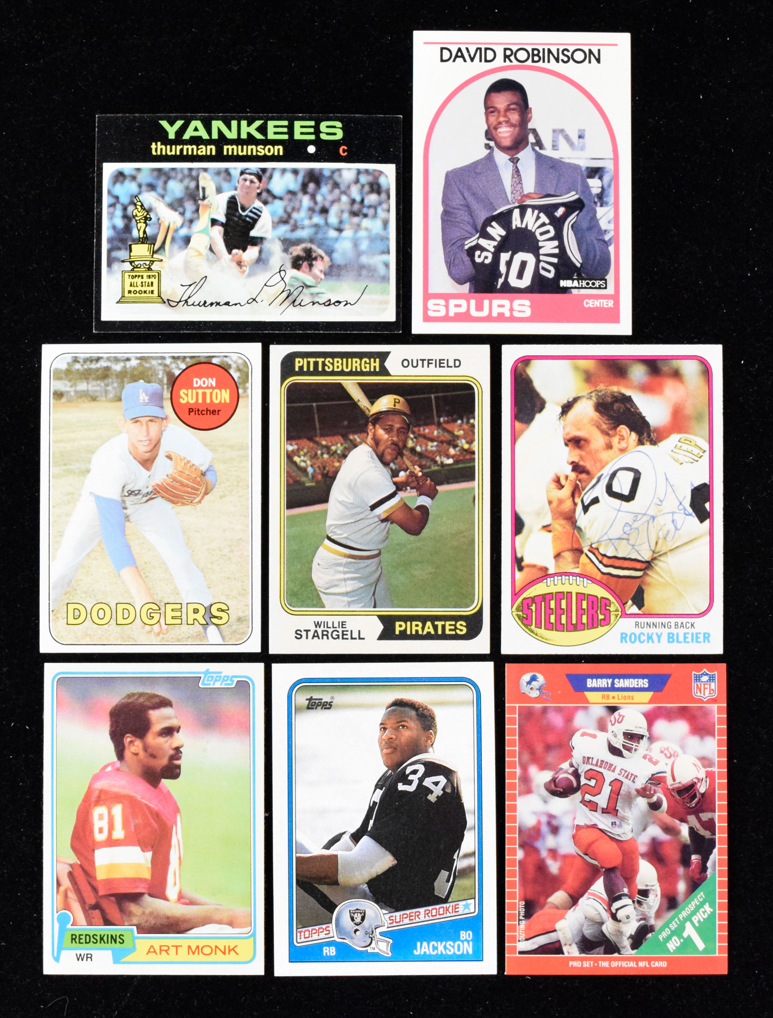 Description:Mixed sports bulk lot of cards and memorabilia (VG-MT). Includes a small percentage of cards from the late 1960s and throughout the 1970s, approx. (2,500) 1980s football cards, approx. (16,000) baseball cards from the late 1980s - early 1990s, approx. (6,000) basketball cards from the late 1980s - early 1990s including (10) 1989-90 NBA Hoops #138 David Robinson rookies and (11) 1989-90 NBA Hoops wax packs, 1976 and 1980 Topps cards signed by Rocky Bleier, 1988 Topps Football set, (3) 1989 Pro Set football sets, 1990 Score Football factory set, 1991 Pro Set PGA Tour factory set, (4) 1-oz. silver medallions (Cooperstown, 2 Roberto Clemente, and Three Rivers Stadium), and a few non-card related items. Most cards are commons but numerous stars, HOFers, and rookies are mixed in. Various conditions throughout the lot, but most appear to average NM overall. Range: VG-MT