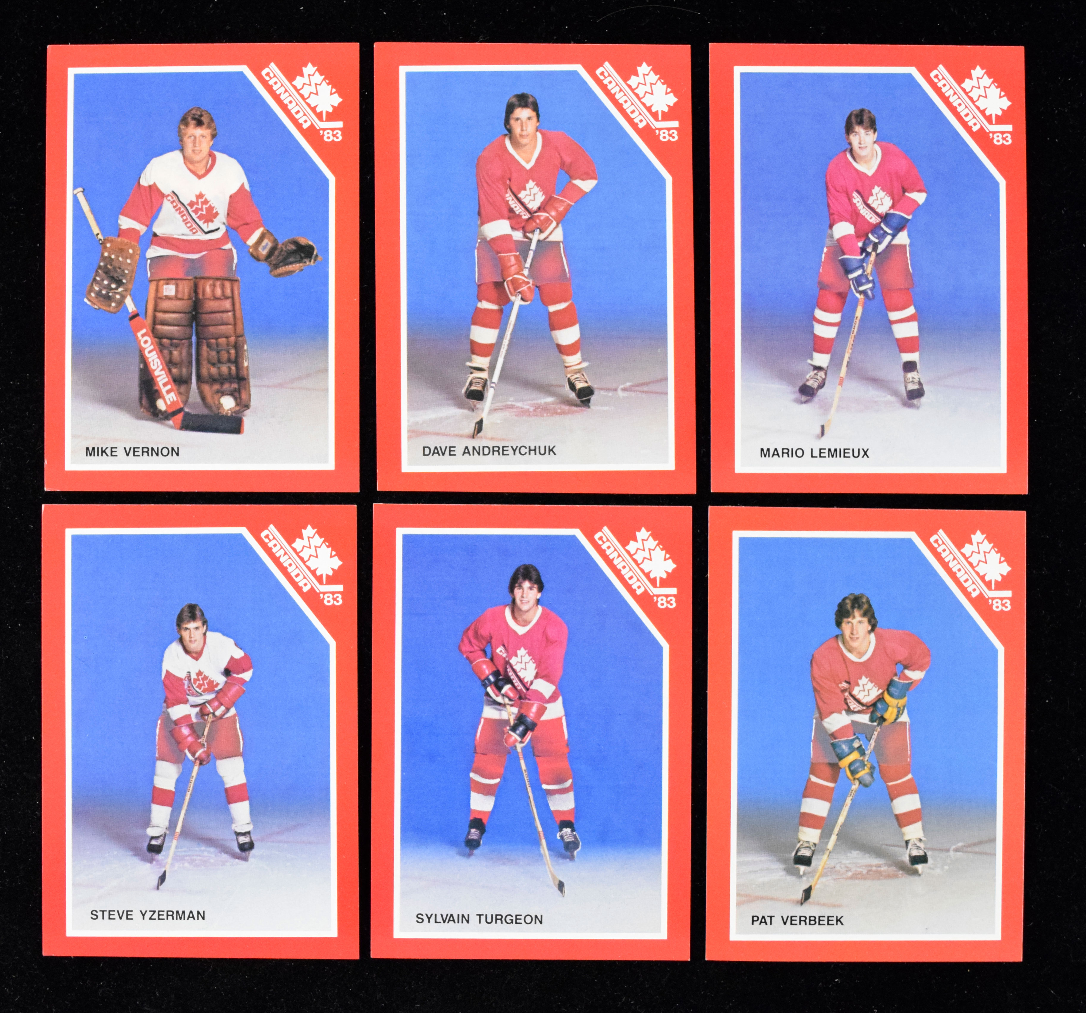 Description:1983 Canadian National Juniors hockey card set with Lemieux rookie (VG-NM). 21-card set with highlights including rookies of Dave Andreychuk (EX/MT), Mario Lemieux (EX/MT), and Steve Yzerman (EX-EX/MT). Remainder appear to average EX/MT overall. Range: VG-NM