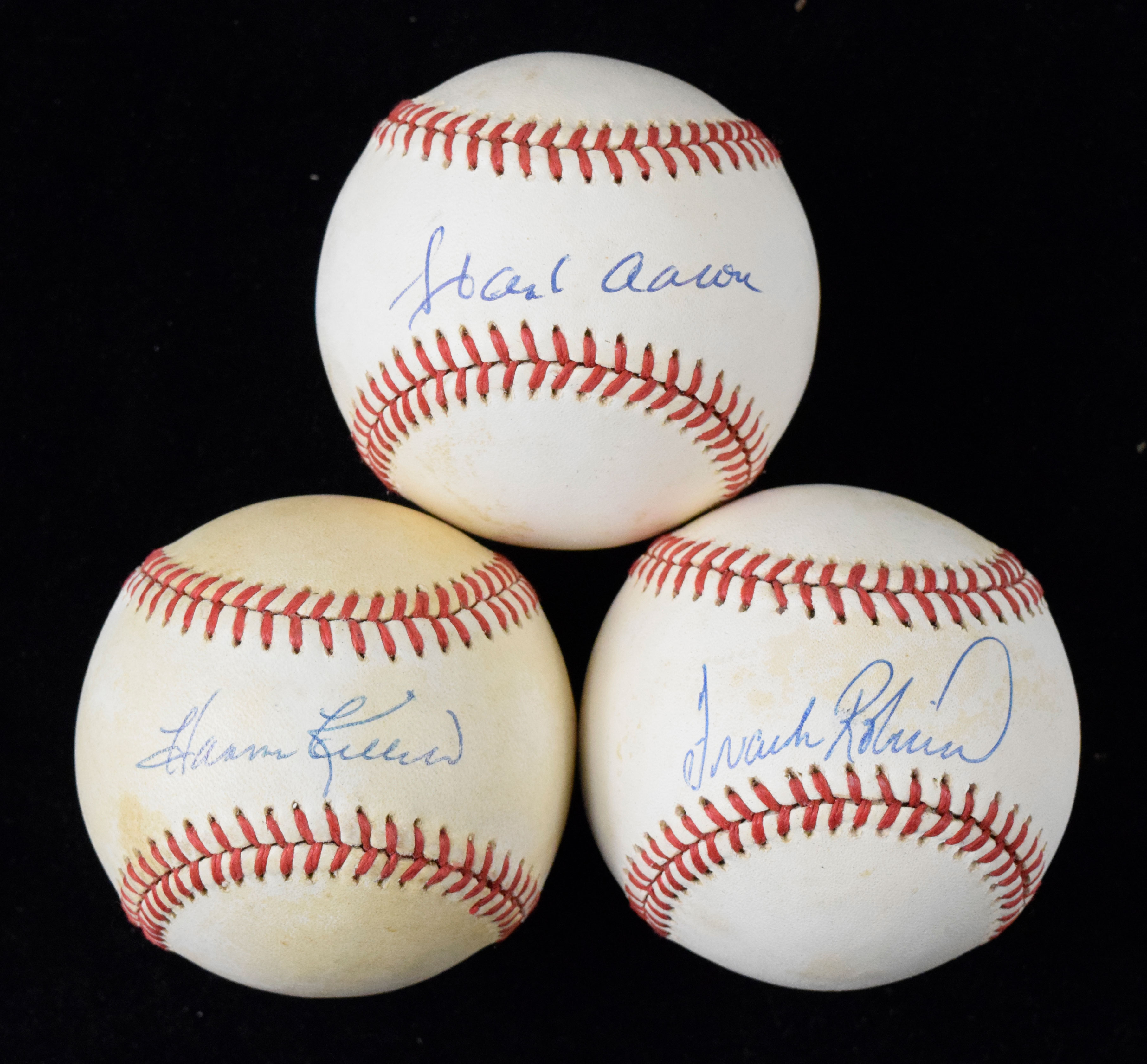 Description:Hank Aaron, Harmon Killebrew, and Frank Robinson signed baseballs (VG-EX/MT). Includes B.Brown AL ball signed by Harmon Killebrew (VG toned), B.Giamatti NL ball signed by Hank Aaron (EX-EX/MT toning), and B.Brown AL ball signed by Frank Robinson (VG/EX-EX toning). Signatures rate 7 to 8/9 out of 10: VG-EX/MT