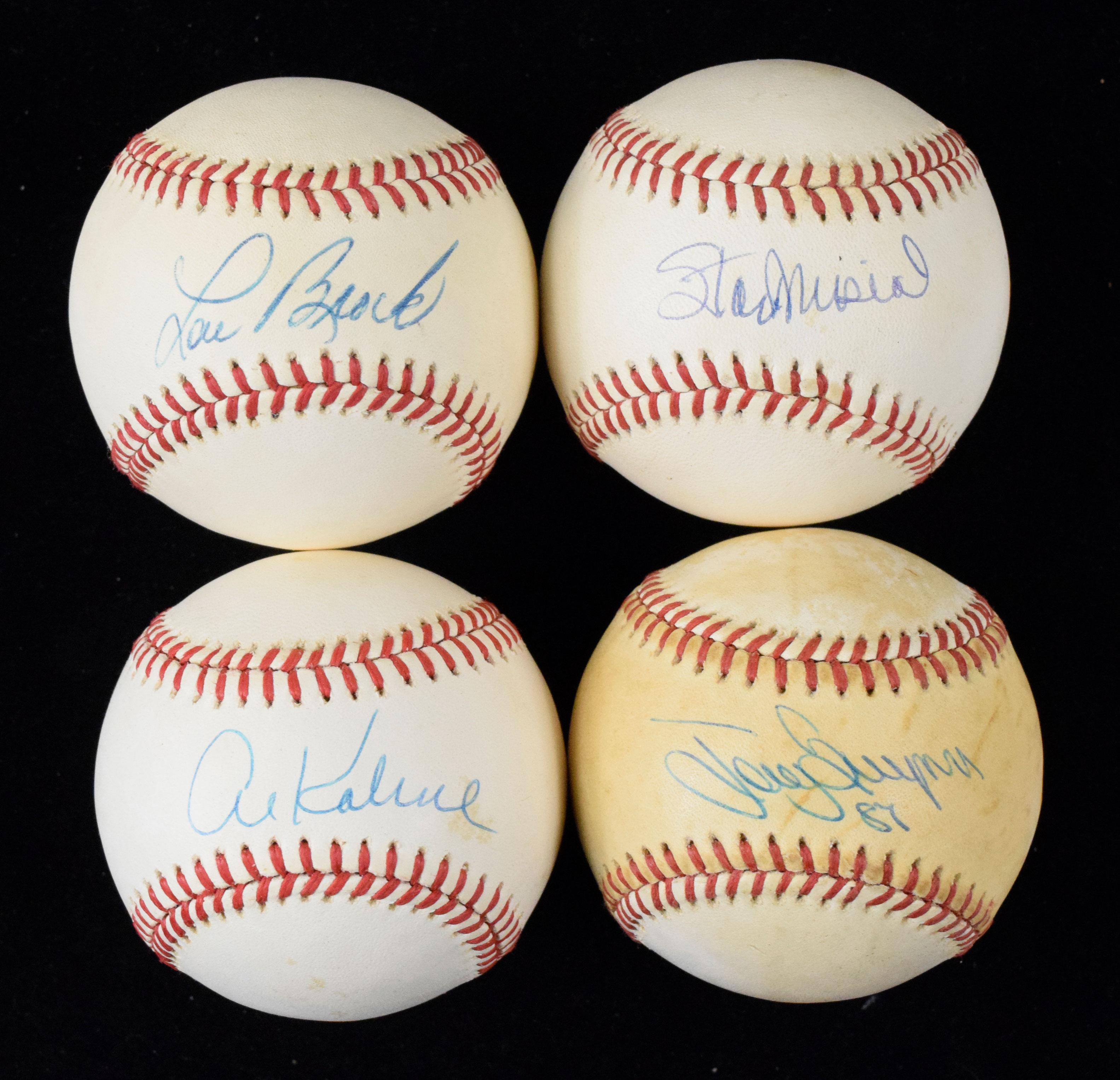 Description:Lot of (6) 3000 Hit Club single-signed baseballs (VG-EX/MT). Includes W.White NL ball signed by Stan Musial, B.Brown AL ball signed by Al Kaline, B.Giamatti NL ball signed by Tony Gwynn, W.White NL ball signed by Lou Brock, B.Brown AL ball signed by George Brett, and W.White NL ball signed by Pete Rose with "All Time Hit King" inscription. Signatures rate 6/7 (Brett) to 9/10 (avg 8) out of 10. Most balls appear to average VG/EX overall due to various degrees of toning (Gwynn most toned). Range: VG-EX/MT